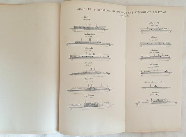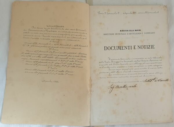 Rara raccolta di appunti editi dal Ministero della Marina sulla guerra di costa. Lezioni fatte alla Scuola di guerra dal capitano di Corvetta Roberto De Luca nell'Aprile maggio 1876-77. Questa copia litografata di appunti manoscritti era parte dellle manualistica che ogni ufficiale della Marina doveva avere e faceva parte dell'archivio di ogni nave. Ogni copia riporta la firma del proprietario che lo aveva in carico. All'interno: Il materiale navale, Fortificazioni da costa, Delle ostruzioni, Torpedini, navi speciali per difesa locale, Impiego dei mezzi di attacco e difesa nelle diverse operazioni, Trasporto delle truppe, Imbarco traversata ed ancoraggio della spedizione, Sbarco della spedizione, Dei bombardamenti marittimi, Assedi marittimi: stretti difesi ecc. Il contenuto era riservato ai componenti della Marina e al Governo. Alcune illustrazioni e tabelle ripiegate. In buone condizioni. Copertina editoriale in buone condizioni generali con lievi usure ai margini e dorso. Gore marginali. Legatura in buone condizioni. Pagine in buone condizioni con fioriture. In folio. cm 35x24,5. Pp. (4)+167.Scarce collection of notes edited by Ministero della Marina about War of Coast. Lezioni fatte alla Scuola di guerra dal capitano di Corvetta Roberto De Luca nell'Aprile maggio 1876-77. This lythographed copy of handwritten notes was part of the manuals each officier of Marinee should have and belonged to the archive of the ship and was considered reserved. Each copy has the signature of the owner. Some illustrations and folded plates. In good conditions. Editorial cover in good conditions lightly worn in the extremities. Dump stains in the extremities. Binding in good conditions. Pages in good conditions with foxing. In folio. cm 35x24,5. Pp. (4)+167.