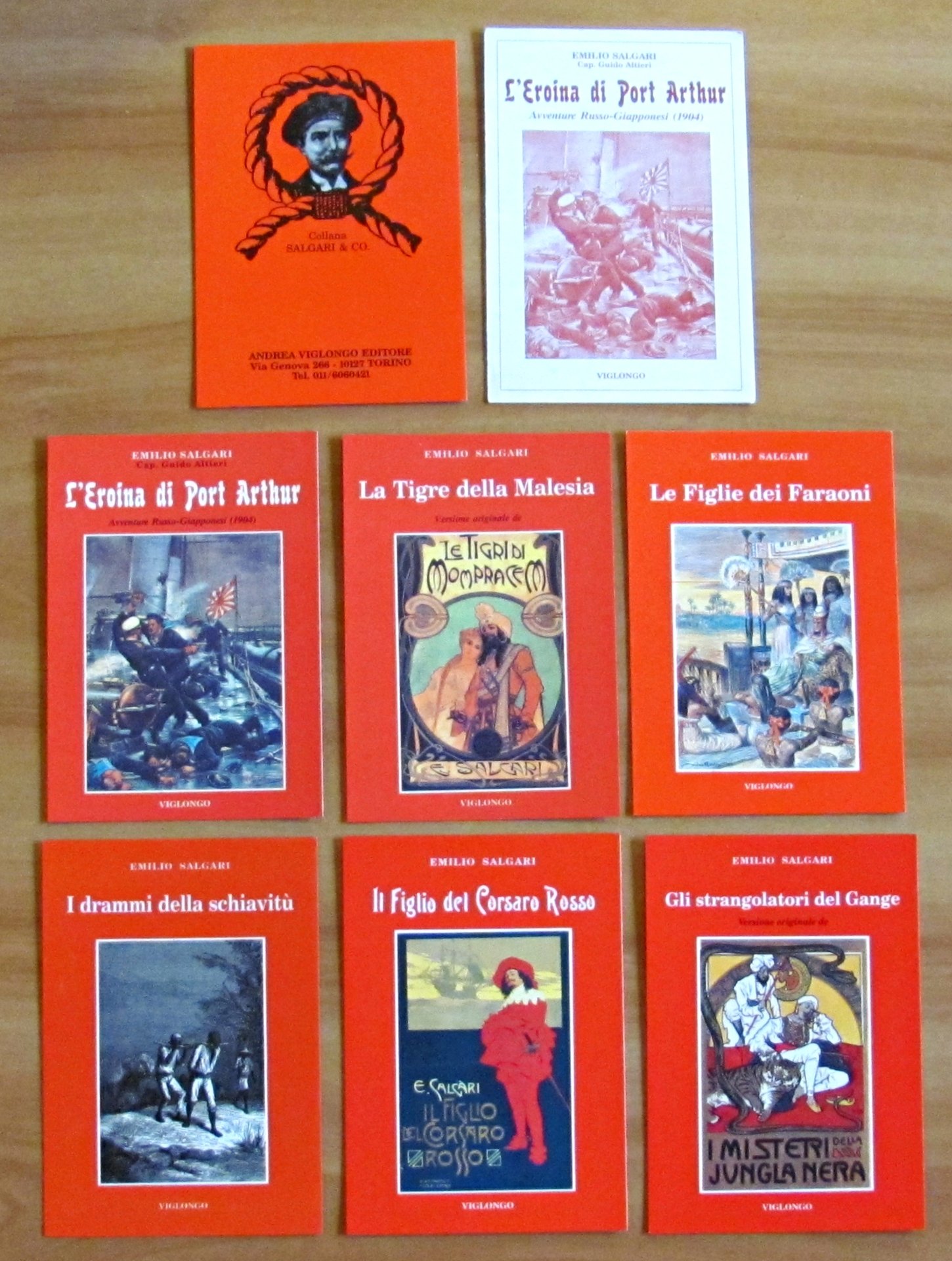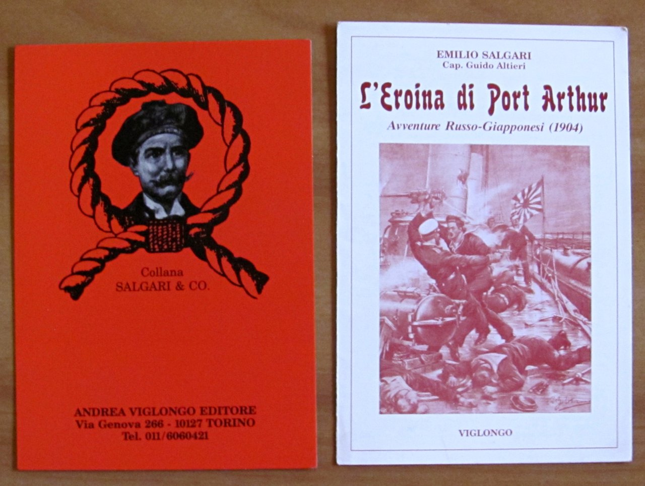 Serie Completa di 6 Cartoline Salgari - Viglongo. Cartolina non numerata come copertina e 6 cartoline numerate da 1 a 6: N.1 - L'Eroina di Port Arthur; N.2 - La Tigre della Malesia; N.3 - Le Figlie dei Faraoni; N.4 - I drammi della schiavitù; N.5 - Il Figlio del Corsaro Rosso; N.6 - Gli strangolatori del Gange + Cedola di Commissione Libraria Viglongo - L'Eroina di Part Arthur. Ed. Viglongo - Torino, s.d. anni '80. Cartoline 15x10,5. STATO di NUOVO. , Perfetto (Mint)