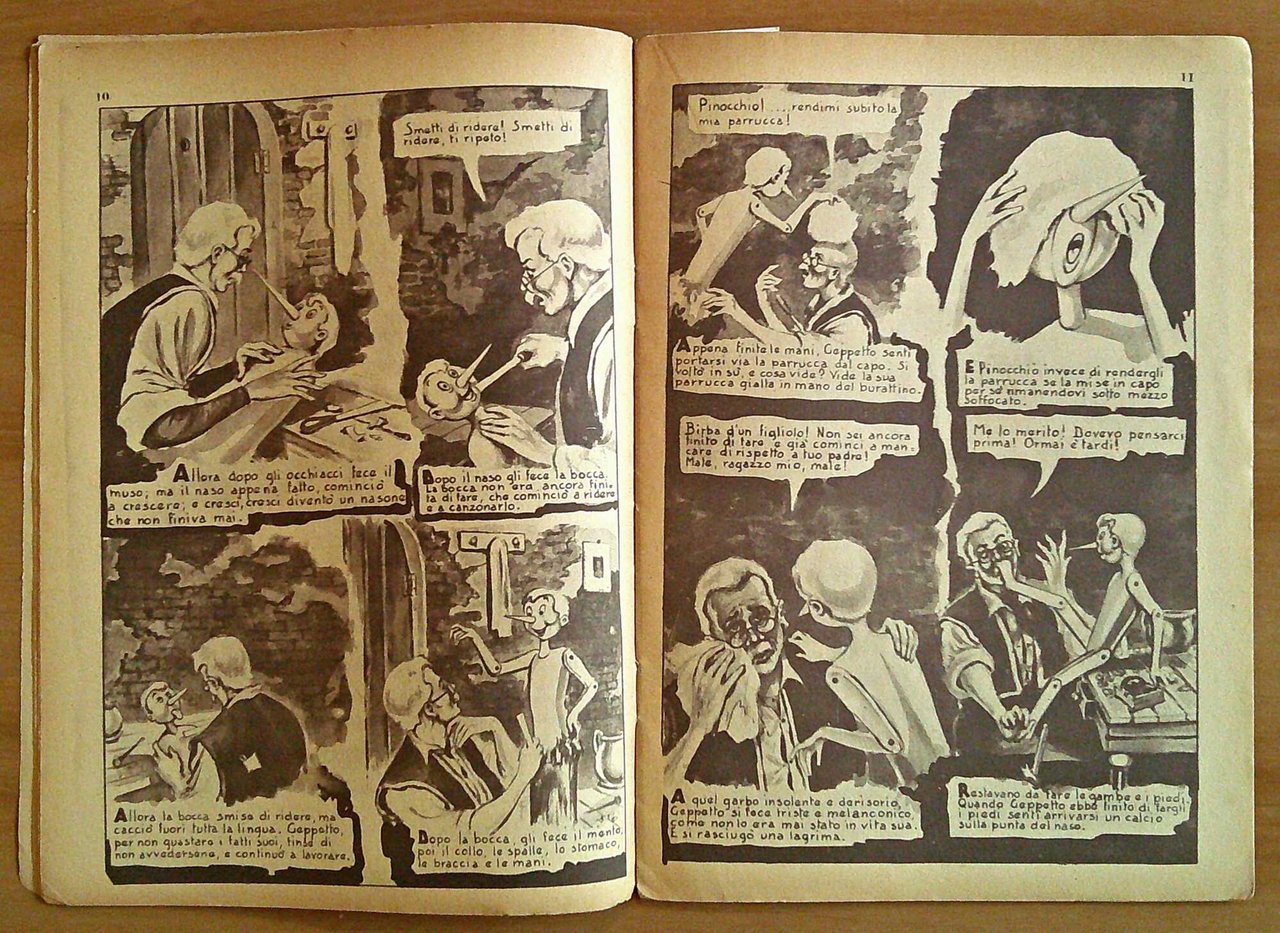 Serie Completa di 6 Fascicoli di Pinocchio. Collana Fiabe e Leggende. Periodico Quindicinale Anno III dal N.1 al N.6. Serie Completa. N.1 - La nascita di Pinocchio (31 Marzo 1955); N.2 - Pinocchio e Mangiafoco (15 Aprile 1955); N.3 - Pinocchio e la Fata dai capelli turchini (30 Aprile 1955); N.4 - Pinocchio infarinato e quasi fritto (15 Maggio 1955); N.5 - Pinocchio al Paese dei Balocchi (31 Maggio 1955); N.6 - Pinocchio diventa un ragazzo per bene (15 Giugno 1955). Illustrazioni in b/n n.t. a tutte le pagine di Elio Tonelli. Ed. S.E.A.L. - Milano, 1955. Fascicoli editoriali spillati. Lievi segni del tempo e imperfezioni marginali solo al N.1 e 2. Peraltro tutti gli altri in Ottimo stato. 17x24; pp.188 (numerazione progressiva). Molto Rara e in Buonissimo stato. , Molto buono (Very Good)