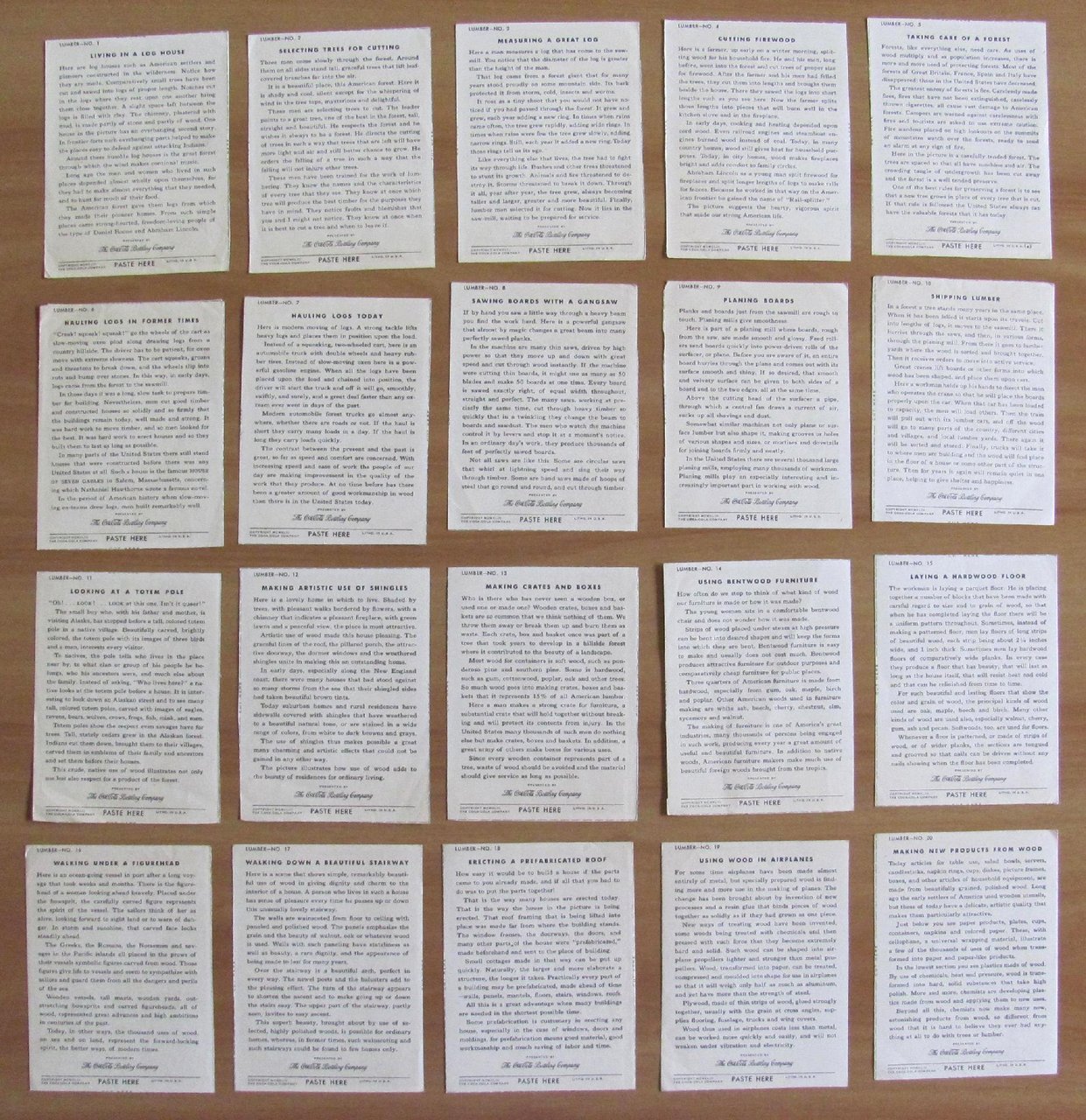 Serie completa di 20 Figurine - The Wood - Presented by The Coca-Cola Bottling Company. Copyright The Coca-Cola Comp. - U.S.A., 1943. Serie completa di 20 figurine, numerate al retro, dedicate al legno. 8x10,5. Rara e in Stato di Nuovo. ,