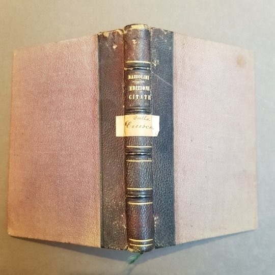 In-16°, pp. 210, (1), mezza pelle coeva con titolo e fregi in oro al dorso. Seconda edizione di questo celebre repertorio che elenca circa 1400 opere della Crusca.