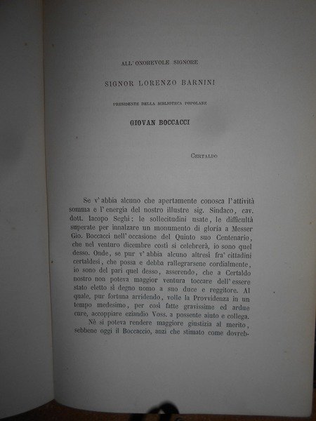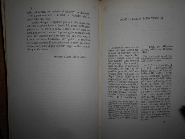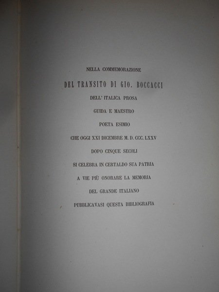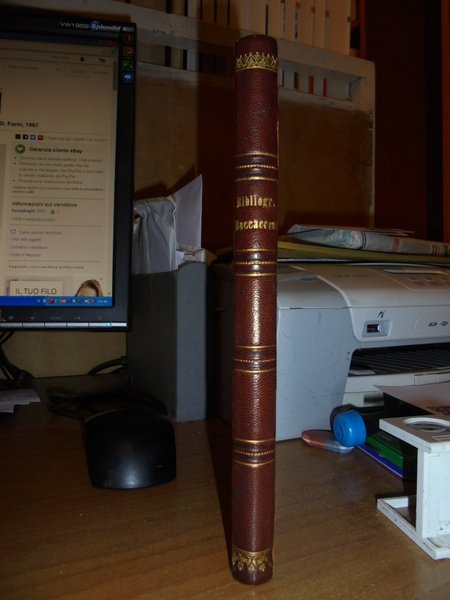 Alberto, Bacchi della Lega. Bologna, Gaetano Romagnoli, 1875. Serie delle edizioni delle Opere di Giovanni Boccacci latine, volgari, tradotte e trasformate. In-8° piccolo, m. pelle coeva con punte, titolo e fregi in oro al dorso. 162 pp. Ottimo esemplare in edizione originale. Neg. mens. bianca cassa
