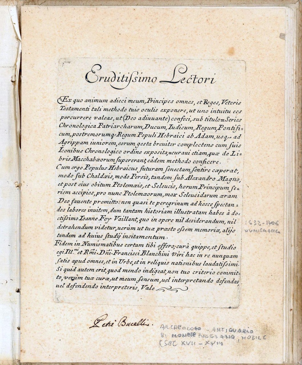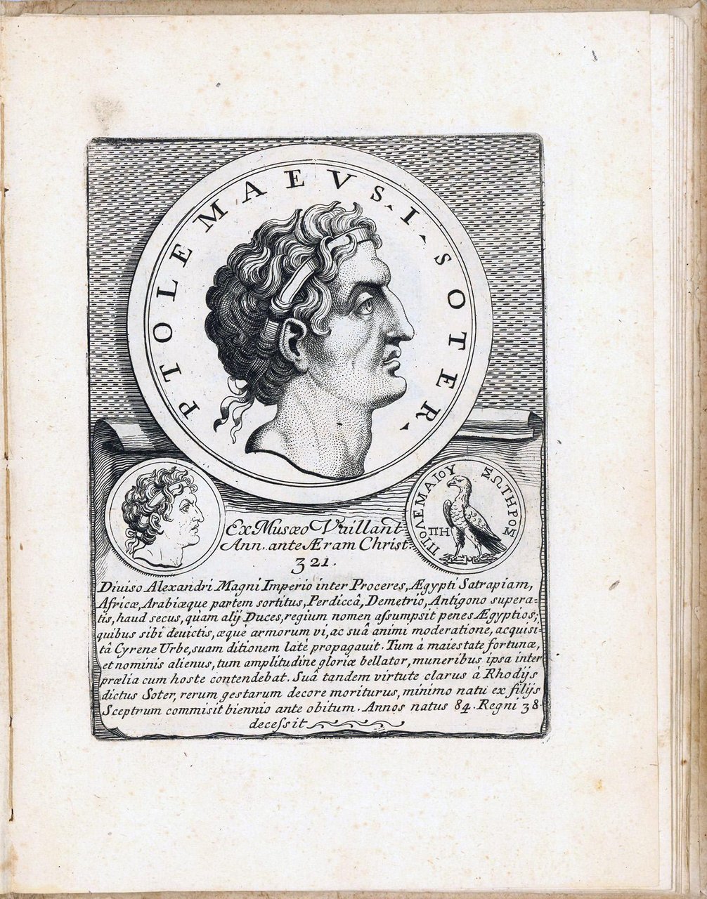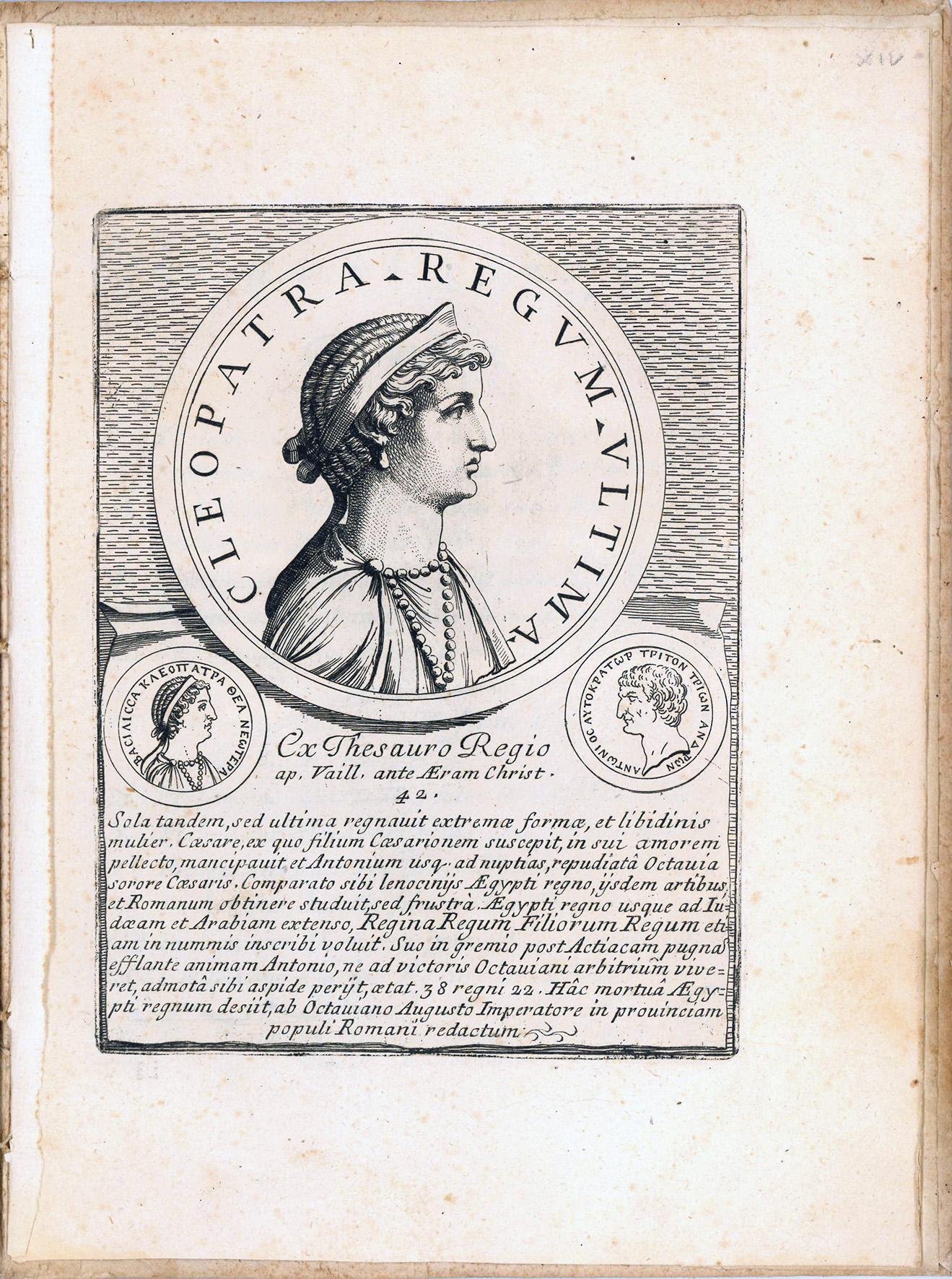 In 4to (mm. 269x198). Cc. [16 di 18]. Mancano le prime due carte contenenti il frontespizio e la dedica a Franceco Farnese duca di Parma e Piacenza. Presenti la dedica al lettore, i 14 ritratti di regnanti tolemaici da Tolomeo I Soter a Cleopatra e l'indice finale. Il libro è interamente calcografico. Gli incisori sono Giovanni Petroschi e Gaetano Piccini. Cartonato coevo. Firma di appartenenza alla prima carta dell'archeologo ed antiquario di Montepulciano Pietro Bucelli. Leggere arrossature e fioriture sparse, segno di tarlo al margine esterno di alcune carte senza danno alla parte incisa. Ottima copia genuina.