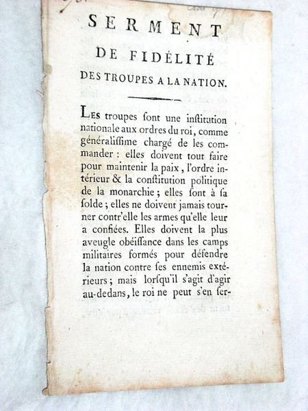 in-8. 4pp. Broché. Feuillets en partie déreliés. Petites mouillures. Publié en 1789, au cœur de la Révolution française, cet ouvrage témoigne d'un moment charnière dans l'histoire de France et dans la relation entre l'armée et le pouvoir. À une époque où la fidélité à la Nation commence à prévaloir sur l'allégeance au monarque, ce texte illustre le basculement des valeurs et le questionnement sur l'autorité et la légitimité. Imprimé à Paris par Letellier, avec l'assistance de L.M. Cellot, ce document capture l'esprit de transformation et de remise en question de l'ordre établi qui caractérise la fin du XVIIIe siècle.