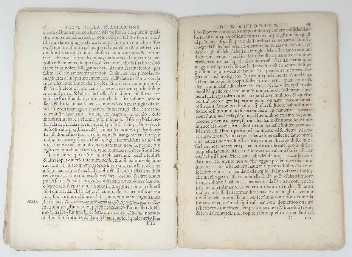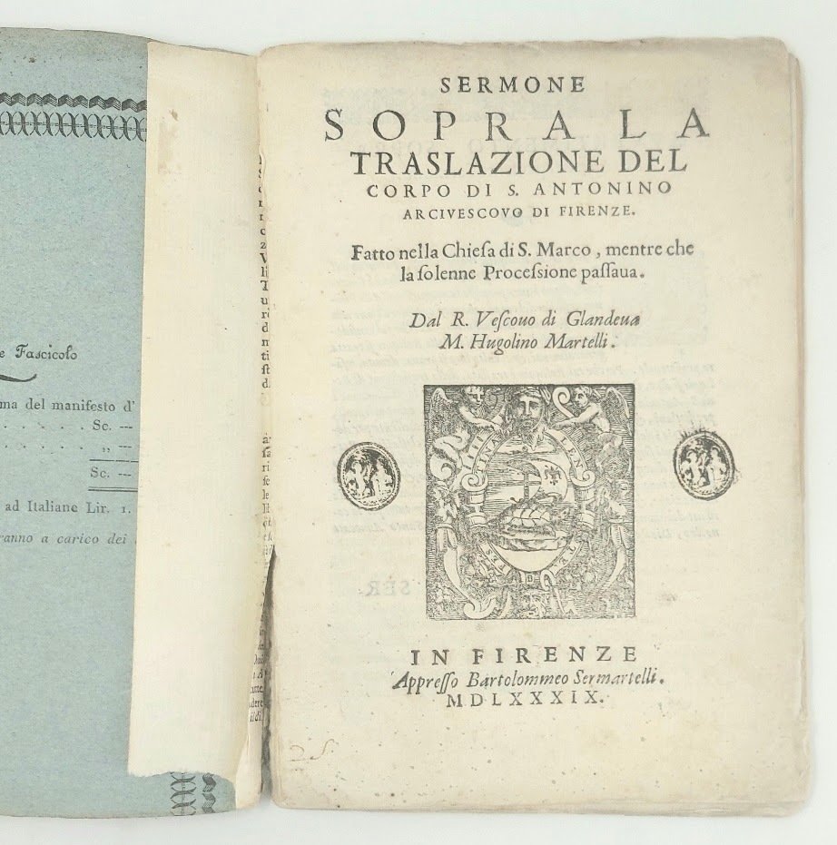 >in-4 (225x155 mm), pp. 30 (manca l'ultima bianca), impresa tipografica al frontespizio, caratteri corsivo e romano, iniziali e fregi xilografici. Carta muta di riutilizzo ottocentesca. Prima ed unica edizione di rara placchetta religiosa composta dall'umanista Hugolino Martini, vescovo di Glandèves, incaricato di pronunciare l'orazione ufficiale in occasione del trasferimento nella chiesa fiorentina di S. Marco delle spoglie di s. Antonino Pierozzi. Buon esemplare, timbri di biblioteca estinta al frontespizio ed ex-libris di Giacomo Manzoni. STC, 419.