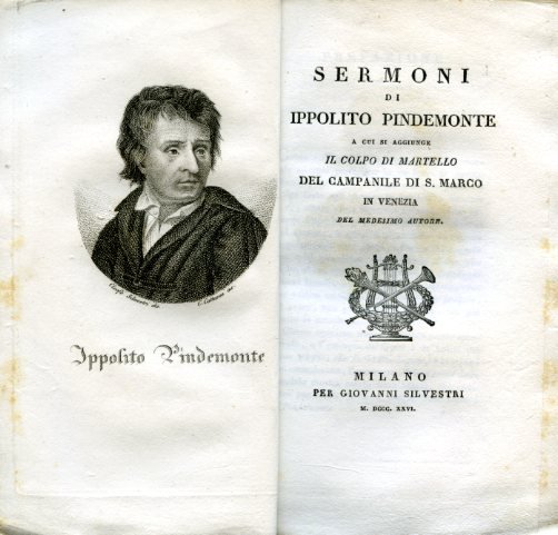 In-8°, pp. (4), 165, (1) di indice, brossura coeva in marmorizzatura policroma rosa e viola. Ritratto dell'autore all'antiporta, inciso su acciaio dal Cattaneo su disegno di Cleofe Silvestri. Piccola vignetta incisa al titolo. In barbe, con qualche fioritura, ben conservato. Riedizione milanese dei 'Sermoni' pindemontiani, seguiti, alle pp. 137 e sgg., da 'Il colpo di martello del campanile di San Marco in Venezia'. Cfr. Gamba, 2655 (ediz. veronese del 1819). Carlo Cordié in Diz. Bompiani d. Opere, VI, 674.