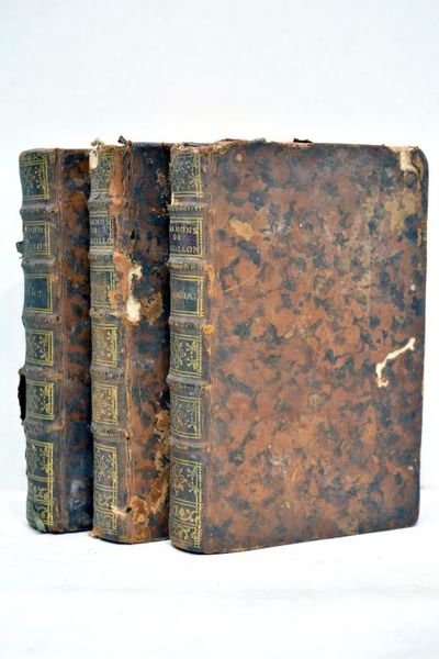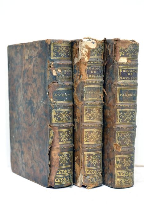 3 volumes. 473 pages + XII. 384 pages + 400 pages. (15,5x10,5cm). Pleine basane. Dos à nerfs orné. Pièces de titre et tomaison maroquin. Filet doré sur les coupes. Tranches rouges. Gardes de papier marbré. Dos frotté. Epidermures et manques de cuir sur le cos. Accidencts aux coiffes. Charnières fendues. Frottements, épidermures et taches sur les plats. Petits manques de cuir les plats. Coins émoussés. Quelques taches à l'intérieur. Légerès traces de mouillure. Quelques pages déchirées par l'humidité (volume 1). Le premier volume comprend les sermons pour l'Avent, le deuxième volume inclut les pensées sur différents sujets de morale et de piété, et le troisième volume comprend les panégyriques.