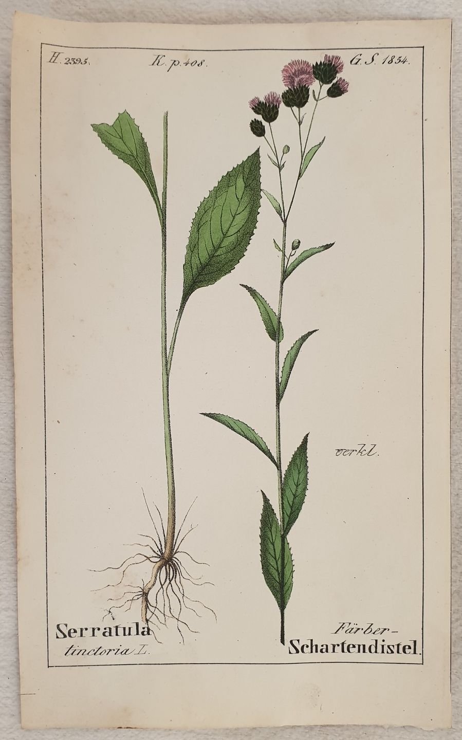 Bella cromolitografia del 1843 tratta dalla celebre opera di botanica "Flora der Schweiz" di Heinrich Romer sulla flora della Svizzera. In buone condizioni, qualche fioritura. Segni di colla al verso. Serratula tinctoria TECNICA: Cromolitografia DIMENSIONI FOGLIO: cm 17,5x11 DIMENSIONI INCISIONE: cm 15,5x9,5 EPOCA: 1843 CONDIZIONI: Buone condizioni, qualche fioritura. Piccoli strappi al margine inferiore. Resto di colla al verso.