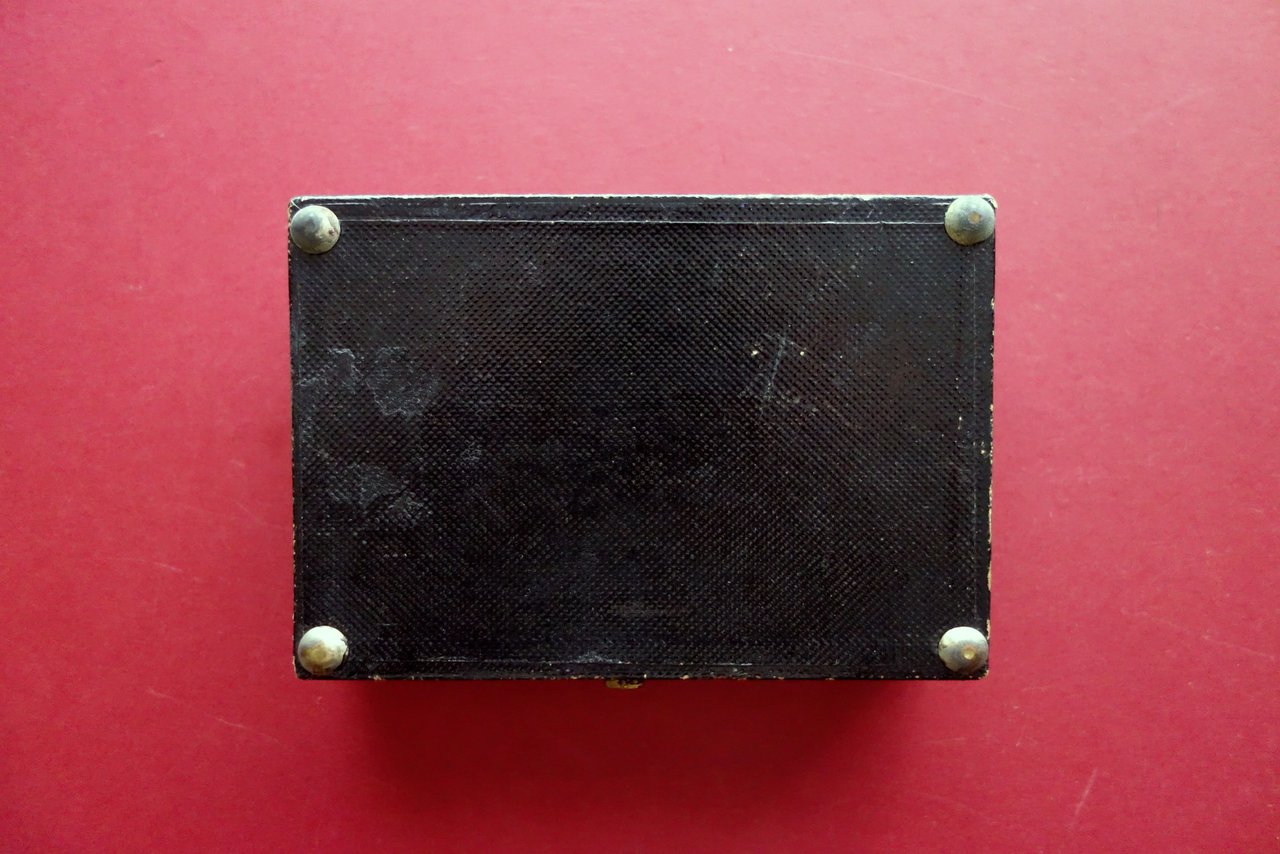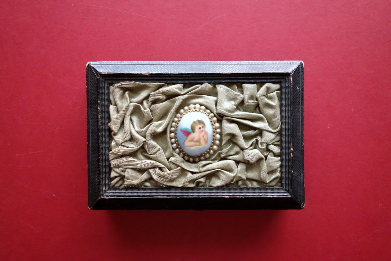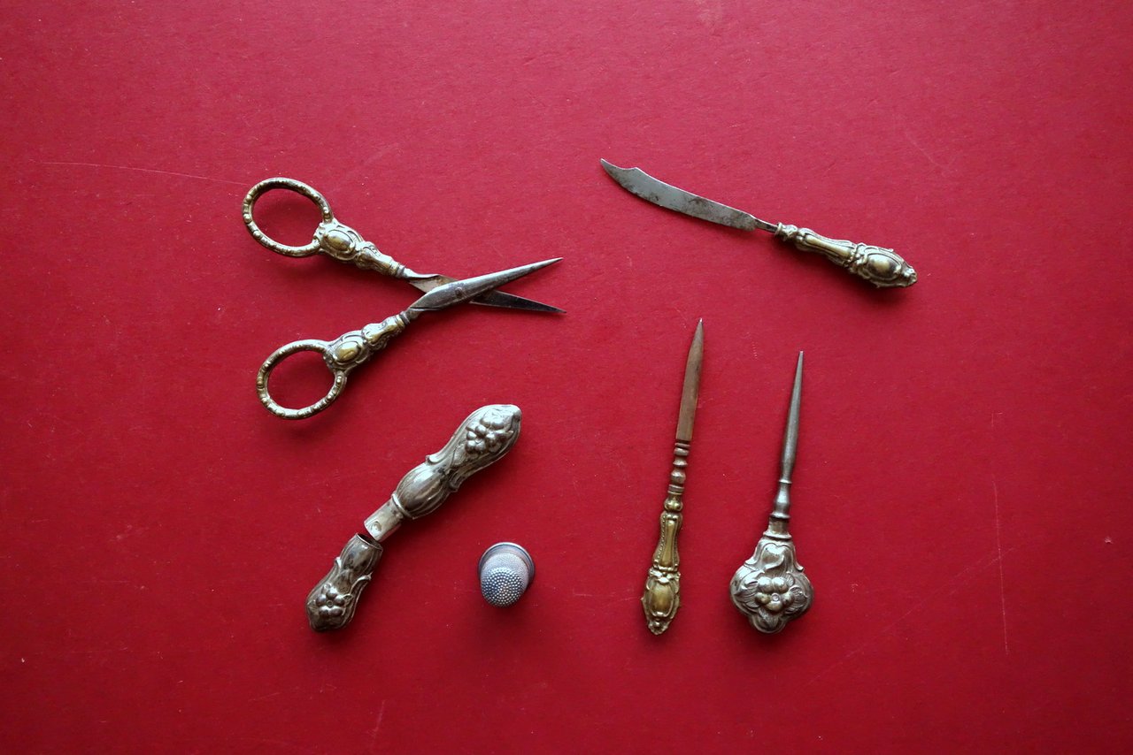 Servizio da cucito in foglia d'argento, Servizio da cucito in foglia d'argento sei pezzi forbici, ditale, taglierino, due punte, porta aghi finemente decorati corredato di bel cofanetto in legno rivestito agli interni e al coperchio in seta verde ripiegata ultimi anni dell'Ottocento - primi anni del Novecento S. d. ma ultimi anni dell'Ottocento - primi anni del Novecento; bel servizio da cucito d'epoca in foglia d'argento, così composto: 1 paio di forbicine; 1 ditale; 2 punte; 1 taglierino; 1 porta aghi. Tutti gli strumenti sono finemente decorati con fregi in rilievo, a motivi per lo più floreali (vedi foto). Il servizio è conservato entro bella custodia in legno rivestita al lato interno e al coperchio in seta verde ripiegata; chiusura in metallo laccato in oro. Al coperchio è applicato piccolo putto decorativi smaltato, contornato da piccola collana in finte perle di fiume (vedi foto). Interamente originale. Cofanetto cm 13,5x9,5x3. Condizioni di conservazione Servizio complessivamente in buone condizioni con segni del tempo; parziale scurimento dell'argento e alcune tracce / segni di ruggine alle estremità e alle punte. Minime tracce di sporco. Per ulteriori dettagli vedi foto. Custodia in buone condizioni con alcune minime / piccole per lo più marginali mancanze e abrasioni al rivestimento del legno, minimi difetti e qualche piccolo sfilacciamento alle sezioni in seta verde. Molto fine. Interamente originale. SC05.L0076 N
