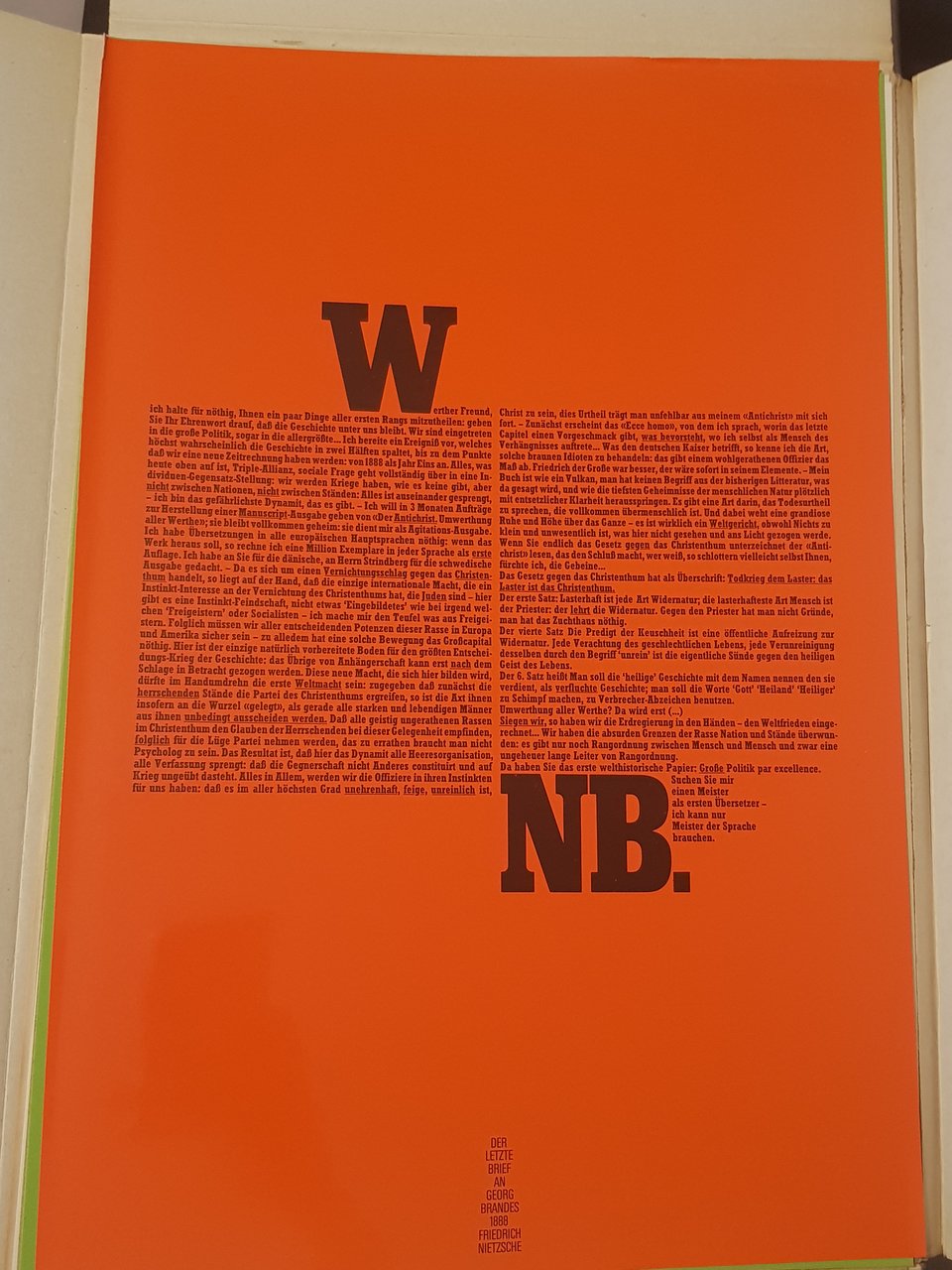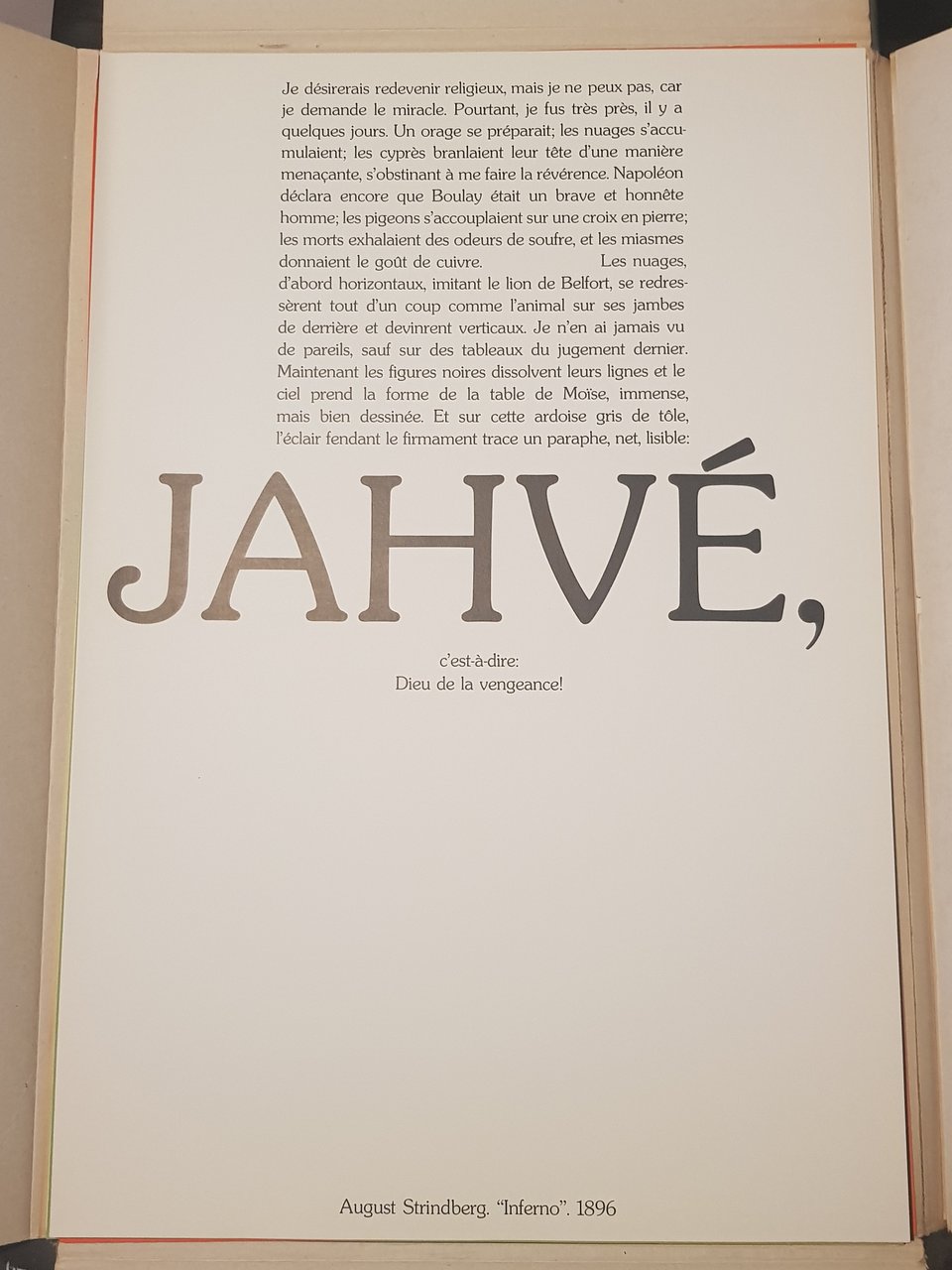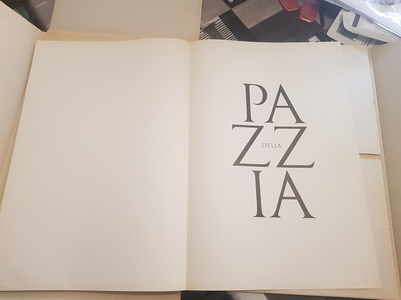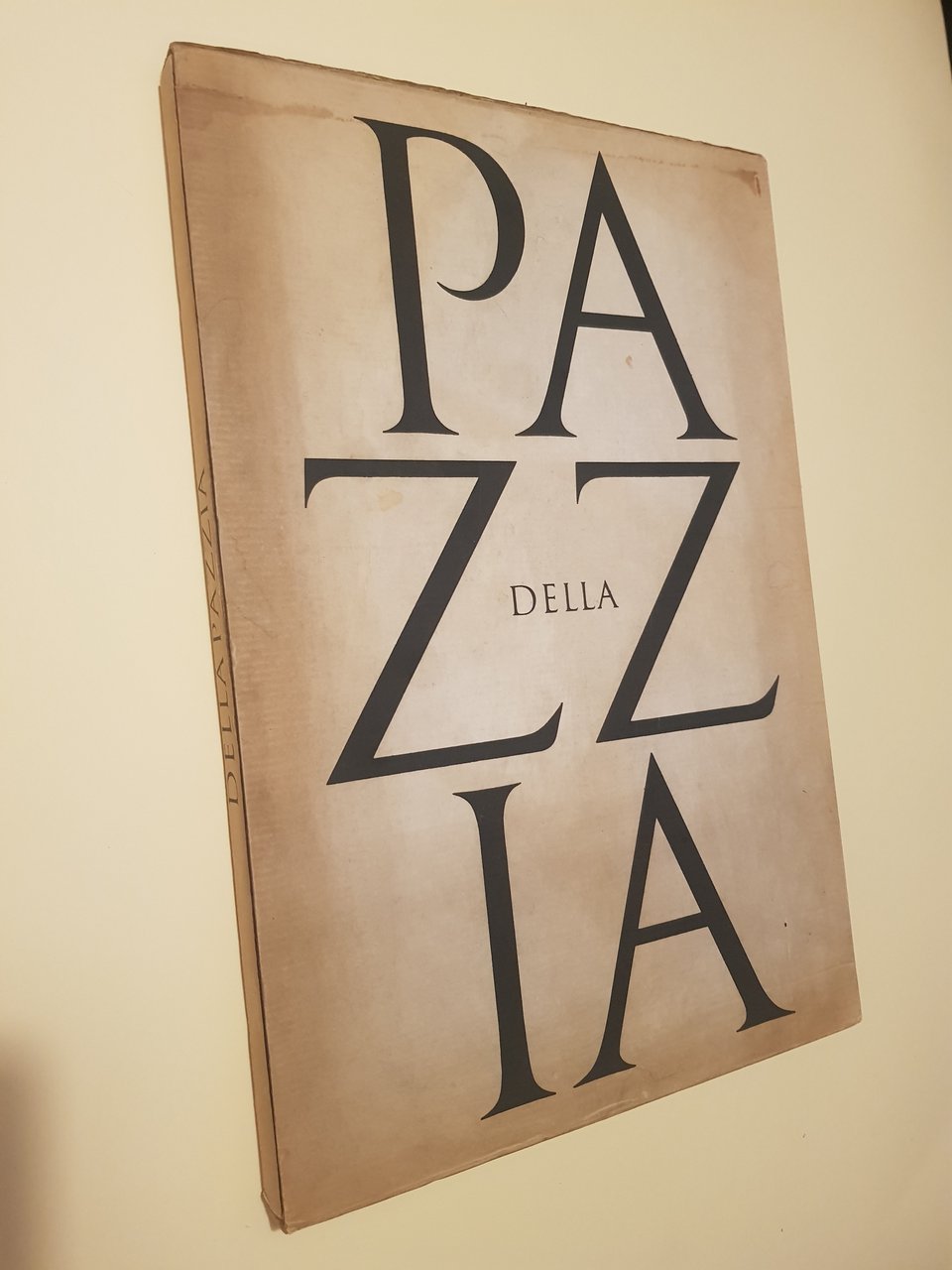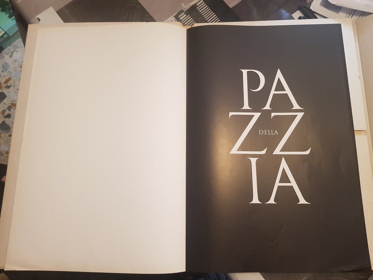 Cartella doppia, di cm. 48 x 33 contenente nella prima tasca: 1 foglio doppio di frontispizio, 1 foglio di colophon,1 foglio doppio con 70 piccoli studi, 40 fogli di disegni in b/n e colore; nella seconda tasca: 1 foglio doppio di frontispizio, 1 foglio con dati bibliografici, 20 fogli di vario peso e tipo di carta, con testi di autori vari, in lingua originale, dedicati alla pazzia e stampati in caratteri diversi (Ariosto, Bulgakov, Bernardino da Siena, Euripide, Campana, Nietzsche, Ginsberg, Shakespeare, Cervantes .), 4 pp. con le traduzioni dei testi riprodotti in originale.<BR>Custodia in cartoncino spesso.<BR>Edizione numerata in 999 esemplari numerati da 1 a 950 e da I e XL (+ 9 fuori commercio) tutti firmati dall'autore. Nostra copia n. 213.<BR>Opera straordinaria e molto rara, soprattutto se completa come in questo caso!<BR>CONDIZIONI MOLTO BUONE di conservazione: solo la custodia presenta alcune abrasioni ed è ingrigita da polvere e fumo; le tavole sono praticamente perfette (una presenta un margine un poco stropicciato). Segnaliamo l'ingiallitura, soprattutto ai margini dei fogli, dovuta alla qualità della carta.