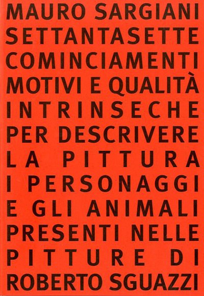 Settantasette cominciamenti, motivi e qualità intrinseche per descrivere la pittura, i percorsi e gli animali presenti nelle pitture di Roberto Sguazzi.