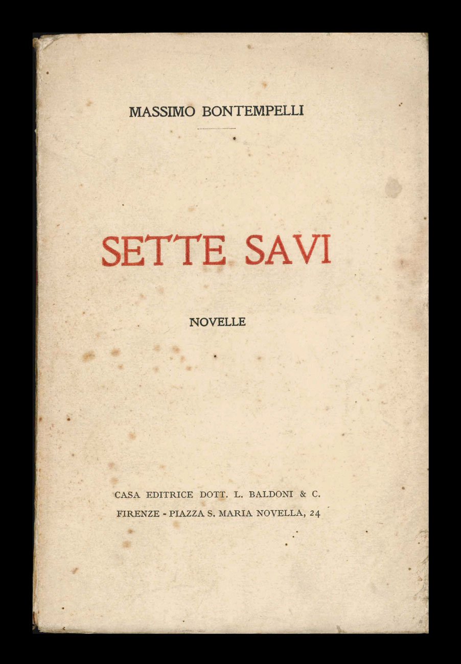 LIBRO Prima edizione. Lievi fioriture e segni del tempo alla copertina; interno uniformemente brunito, a fogli ancora chiusi; primo fascicolo leggermente allentato. Terza raccolta di racconti dell’autore, pubblicata nel periodo in cui ancora Bontempelli si divideva tra la prosa e la poesia. Dei primi tre libri narrativi dello scrittore — tre raccolte di novelle pubblicate tra 1908 e 1910 — questa è l’unica ripresa dopo la guerra, con un’edizione Vallecchi nel 1922 e una Mondadori nel 1925. -- «Alcuni racconti del “Socrate moderno” [la prima raccolta pubblicata a Torino nel 1908] e dei “Sette savi”, pur non presentando nessuna aperta velleità innovativa, esprimono già abbastanza chiaramente certe linee di tendenza nella costruzione delle situazioni e delle psicologie, che lasciano indovinare gli sviluppi successivi. Il timbro stilistico dominante è quello di un intimismo macerato d'ironia malinconica, che ha richiamato a taluni critici (con qualche forzatura) i nomi dei contemporanei Pirandello e Palazzeschi […]. Fra i temi più diffusi […] troviamo (soprattutto nei “Sette savi”) casi bizzarri di originalità psicologica confinanti col patologico (“Il giusto mezzo”) o, più semplicemente, umoristiche divagazioni sulla stranezza del carattere umano (“La paura di morire”)». Oltre ai due racconti citati da professor Asor Rosa nella voce del «Dizionario biografico degli italiani» (vol. 12, 1971), la raccolta include: «La regola», «L’iniquità», «La giustizia e la vendetta», «Il ribelle in riga», «L’ombra e il sole».