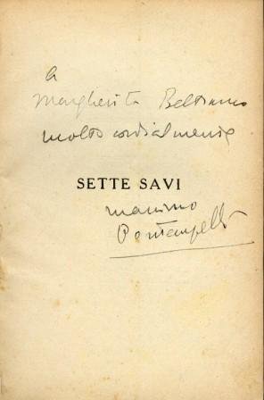 In-8°, pp. 151, (4), brossura editoriale azzurra con titolo in rosso e nero e logo editoriale entro quadruplice filettatura azzurra. Dedica autografa 'A Margherita Beltramo molto cordialmente Massimo Bontempelli'. Ottimo esemplare con minime ingialliture ai margini. Quinta edizione (la prima è del 1912), nella collana 'I Libri Azzurri', di questa raccolta di racconti bontempelliani. 'Sette savi è un libro nel quale la precaria situazione dell'uomo 'umano', che tenta d'inserirsi in una vita moderna e borghese, cioè disumana, è già avvertita secondo un'angolazione pirandelliana: come nei racconti 'Il giusto mezzo', 'La paura di morire', 'Il ribelle in riga'. Possiamo pensare al palazzeschiano 'Palio dei buffi', ma con un anticipo di molti anni' (Luigi Baldacci in Branca, Diz. critico d. lett. italiana, I, p. 379).