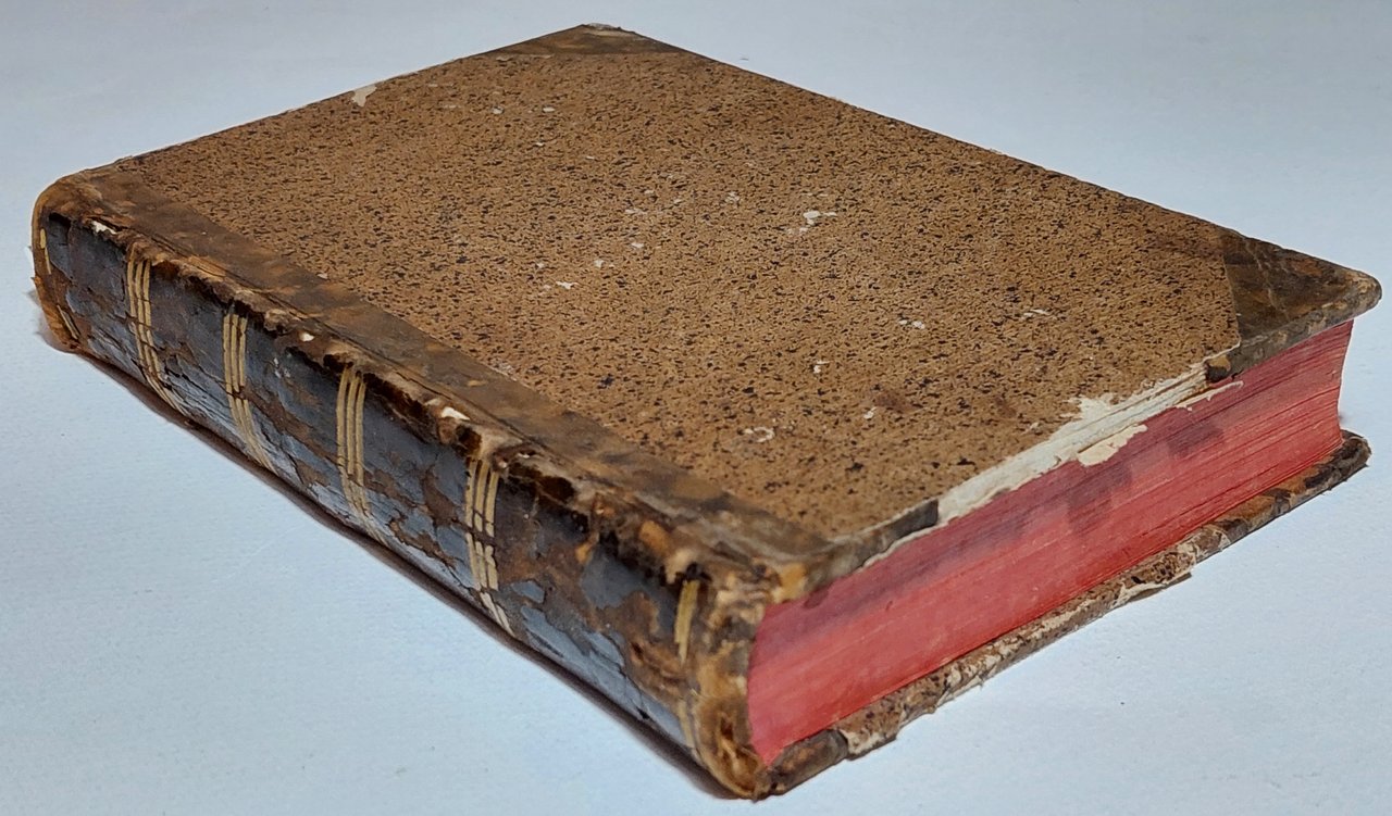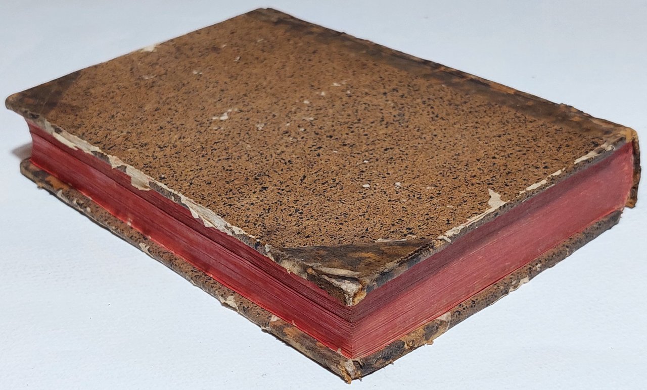 Legatura in mezza pelle con punte, fregi in oro al dorso, piatti in cartonato rigido, la legatura è in precarie condizioni con piccoli strappi macchie e mancanze, tagli rossi.