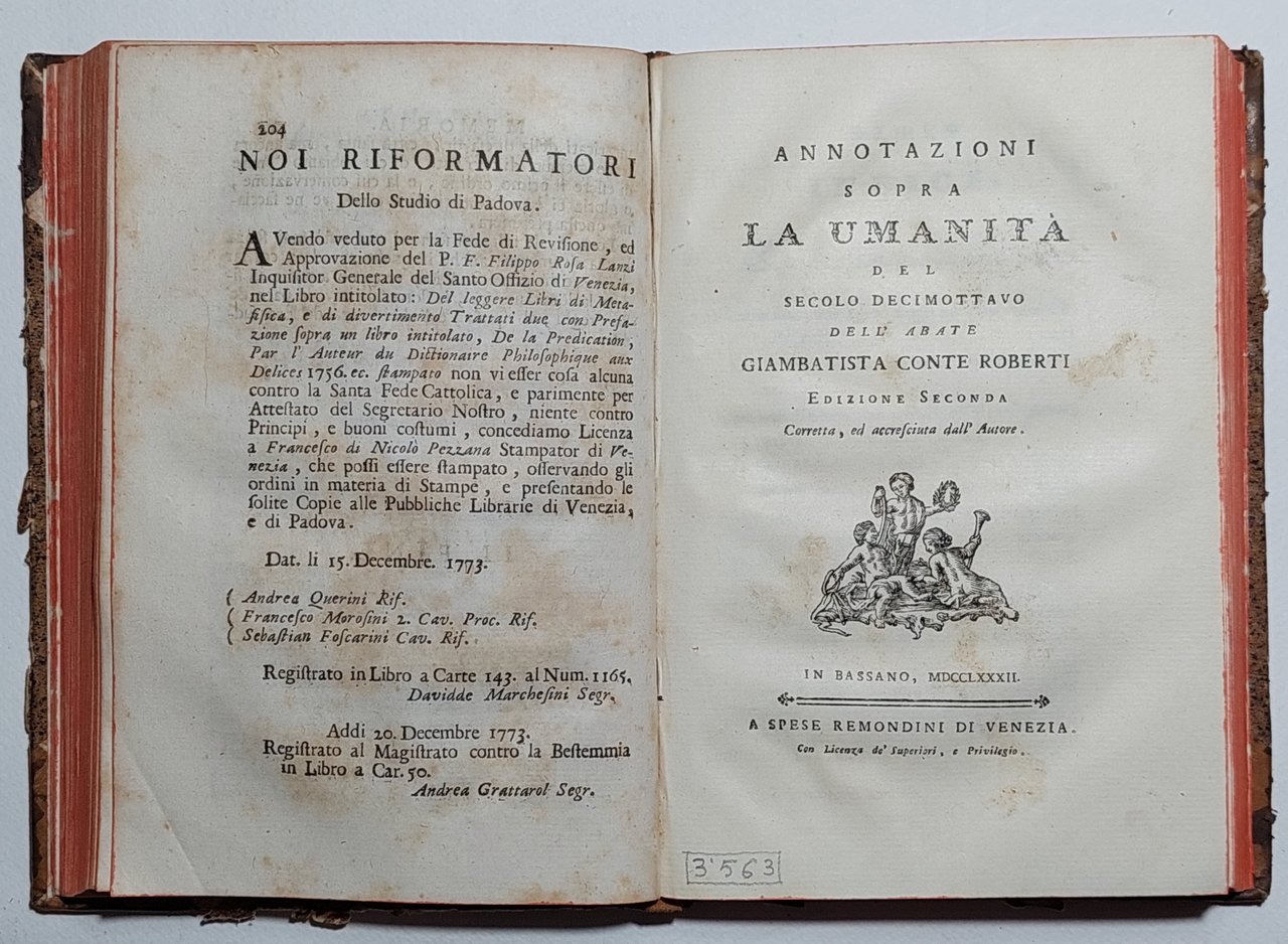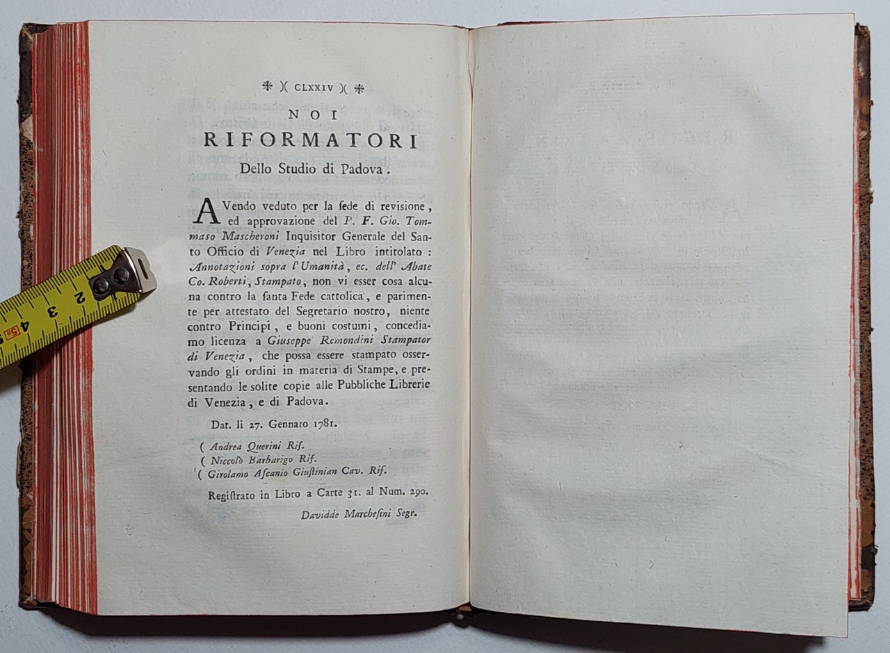 Annotazioni sopra la umanità del secolo XVIII dell'Abate Giambattista Conte Roberti 1782 pp. CLXXXIV