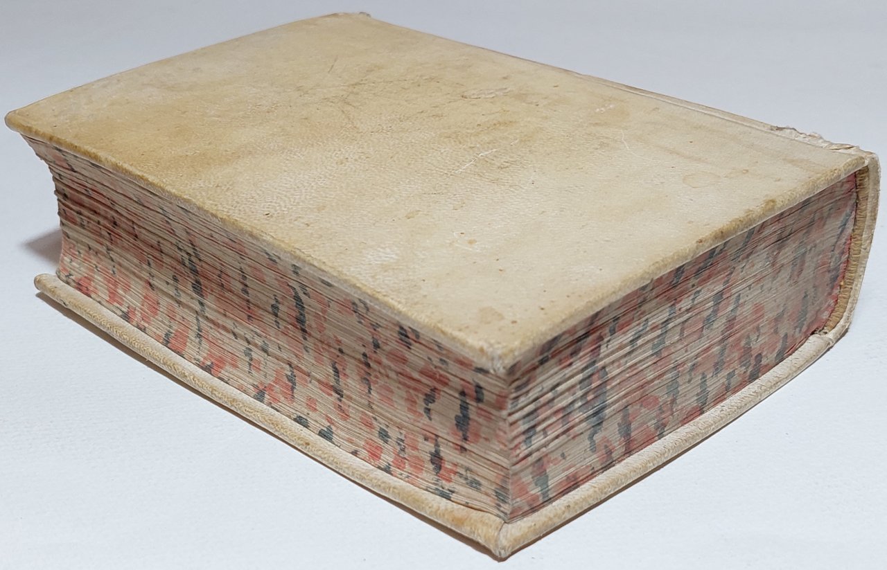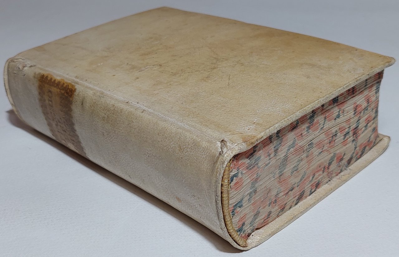 Legatura coeva in pergamena rigida, tassello al dorso con titolo in oro, tagli marmorizzati. La legatura presenta numerose macchie e qualche piccola mancanza. Due opere in un volume, la seconda in due tomi. cm. 17,5 x 12