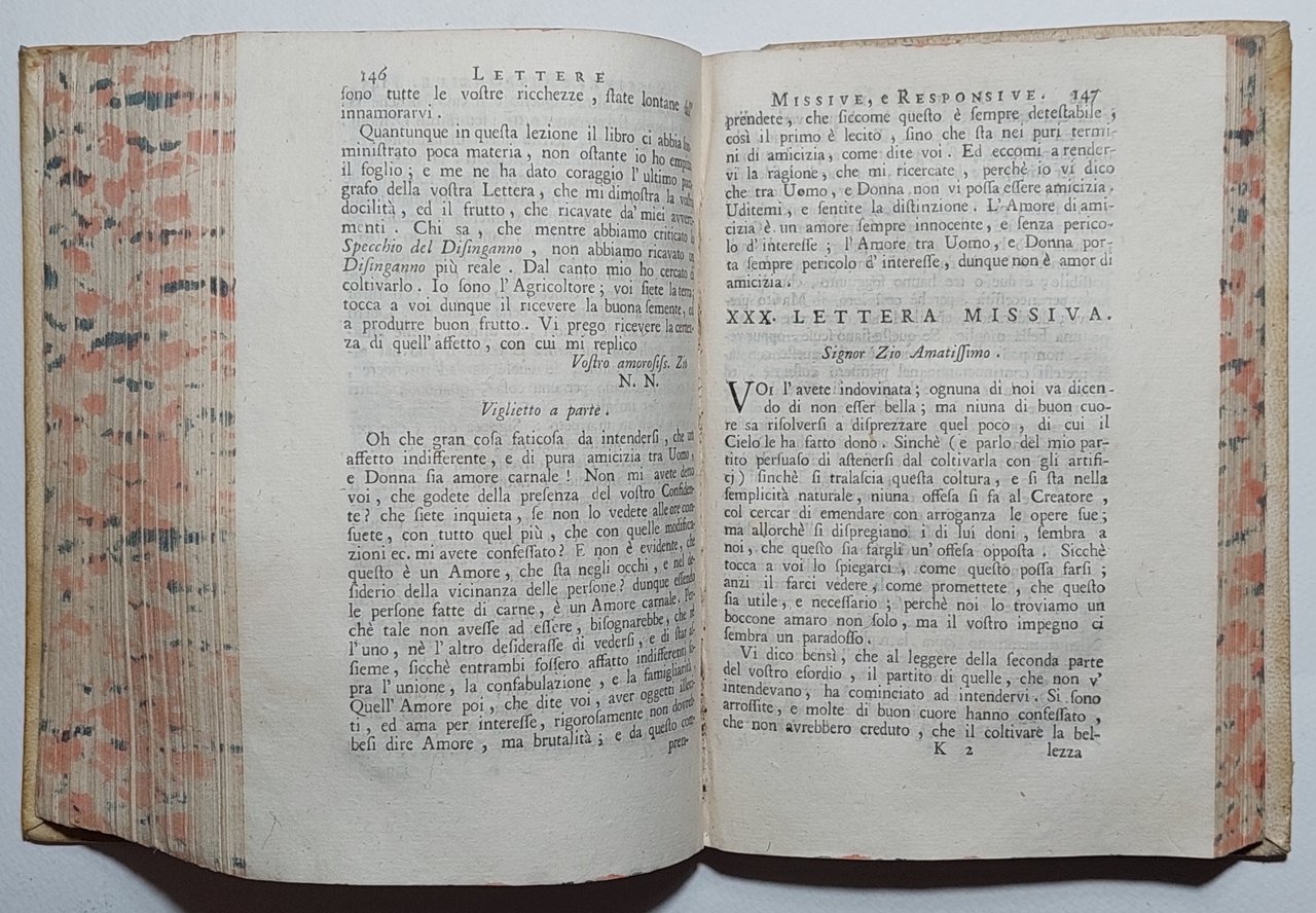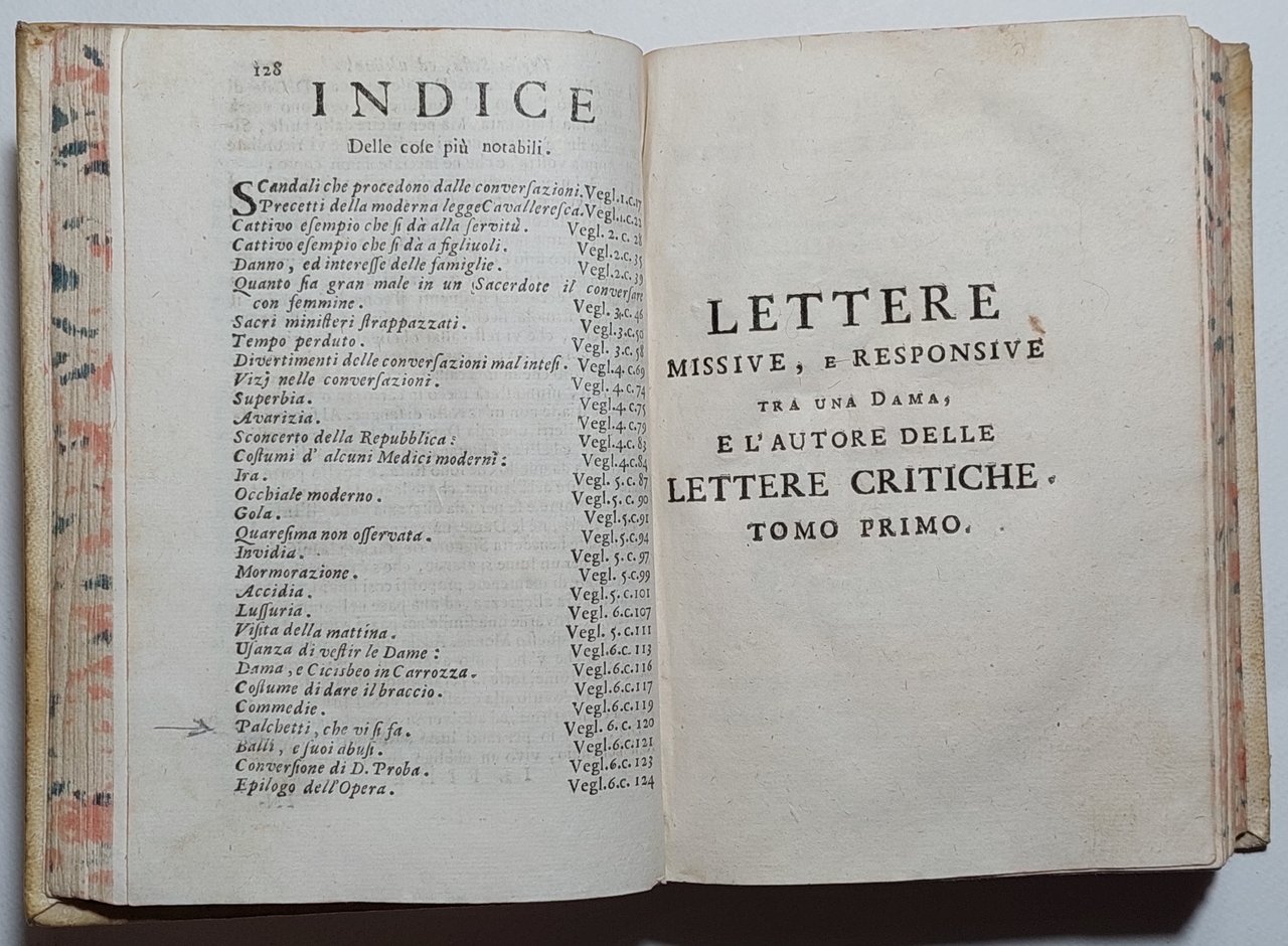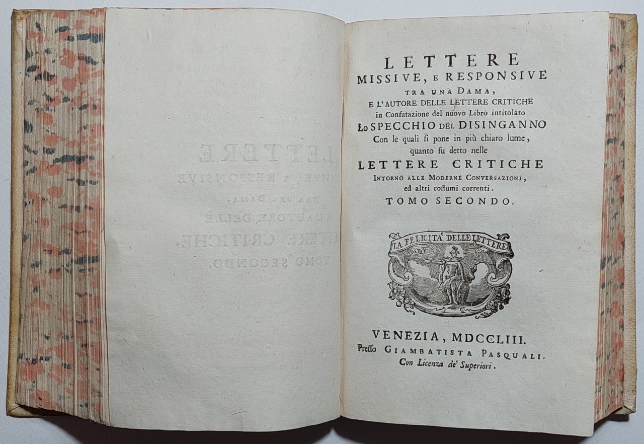 Unito a: Lettere missive e responsive tra una dama e l'autore delle lettere critiche in confutazione del nuovo libro intitolato lo specchio del disinganno Venezia Giambattista Pasquali 1753 Tomo I e II.