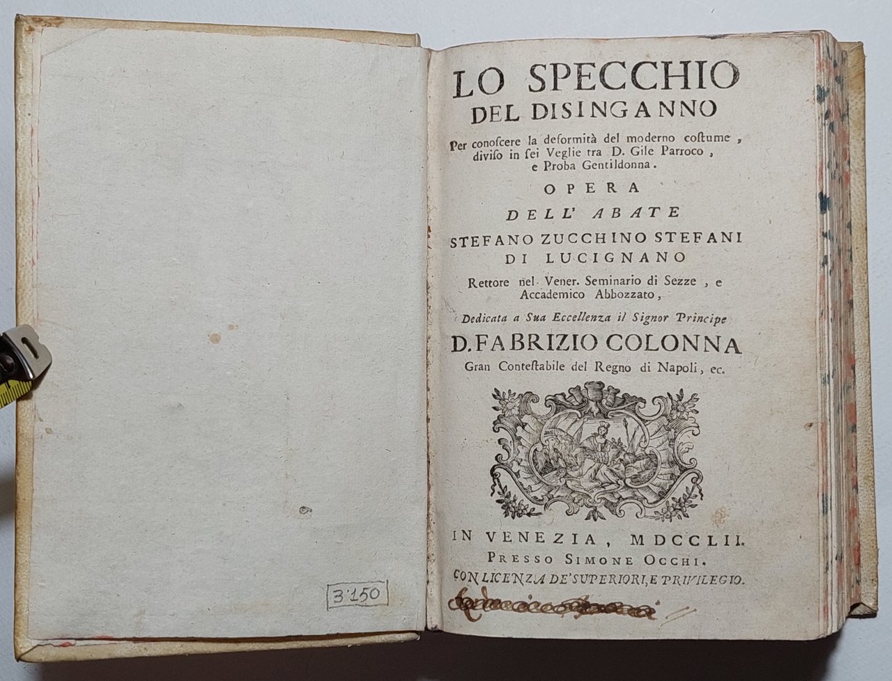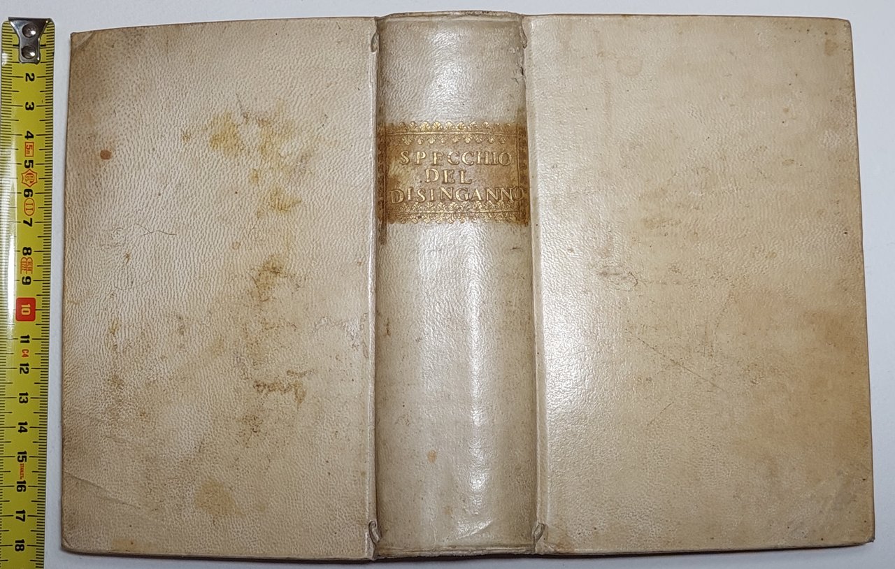 Lo specchio del disinganno: pp. 128 frontespizio leggermente brunito con scritte a penna al margine inferiore cancellate, una macchia al margine inferiore da pagina 101 a pagina 104, sottolineature a matita su alcune pagine.