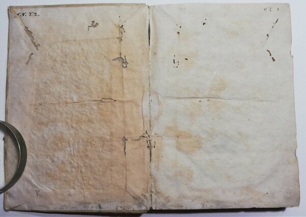 Legatura in pergamena rigida molto sciupata, macchie mancanze e fori di tarlo ai piatti e al dorso, numerosi fori di tarlo ai fogli di guardia e alla prima e ultima pagina bianca, alcuni piccoli fori di tarlo al margine sinistro delle prime due pagine, una leggera gora di umidit‡ al margine inferiore di tutte le pagine, alcune pagine leggermente brunite. Un piccolo foro al margine destro di pagina 13