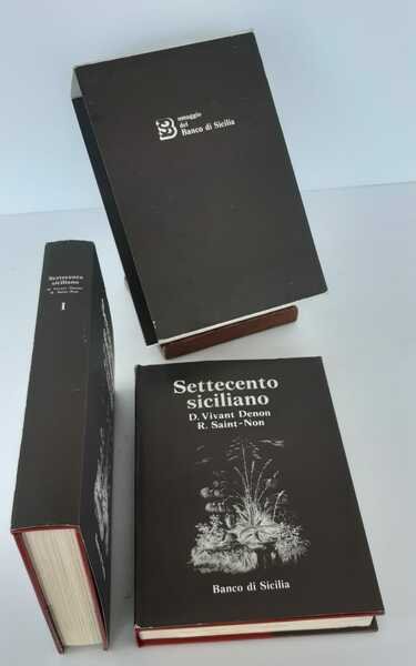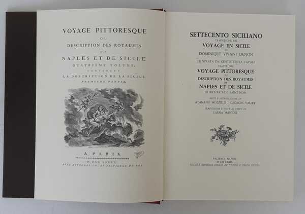 Due volumi in folio, pagg.388 ed indici; pagg.121 di tavole-indici. Legature editoriali rigide con sovraccoperte a stampa. Settecento Siciliano, traduzione del Voyage en Sicile illustrata da 130 tavole. Ristampa anastatica perfettamente conservata con le note ed introduzioni di Atanasio Mozzillo e Georges Vallet e le traduzioni di di Laura Mascoli. Omaggio del Banco di Sicilia. Minimi segni del tempo, praticamente impercettibili, alle sovraccoperte ed al cofanetto, interno immacolato.
