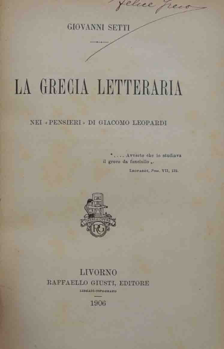 Giovanni Setti, La Grecia letteraria nei Pensieri di Giacomo Leopardi, Raffaello Giusti Editore, Livorno 1906, pp. X, 302, cm 19, legatura in mezza tela nera con titoli manoscritti al dorso. Firma d’appartenenza all’occhiello e alla pagina successiva. Leggere fioriture, qualche sporadica annotazione manoscritta ai margini, per il resto ben conservato.