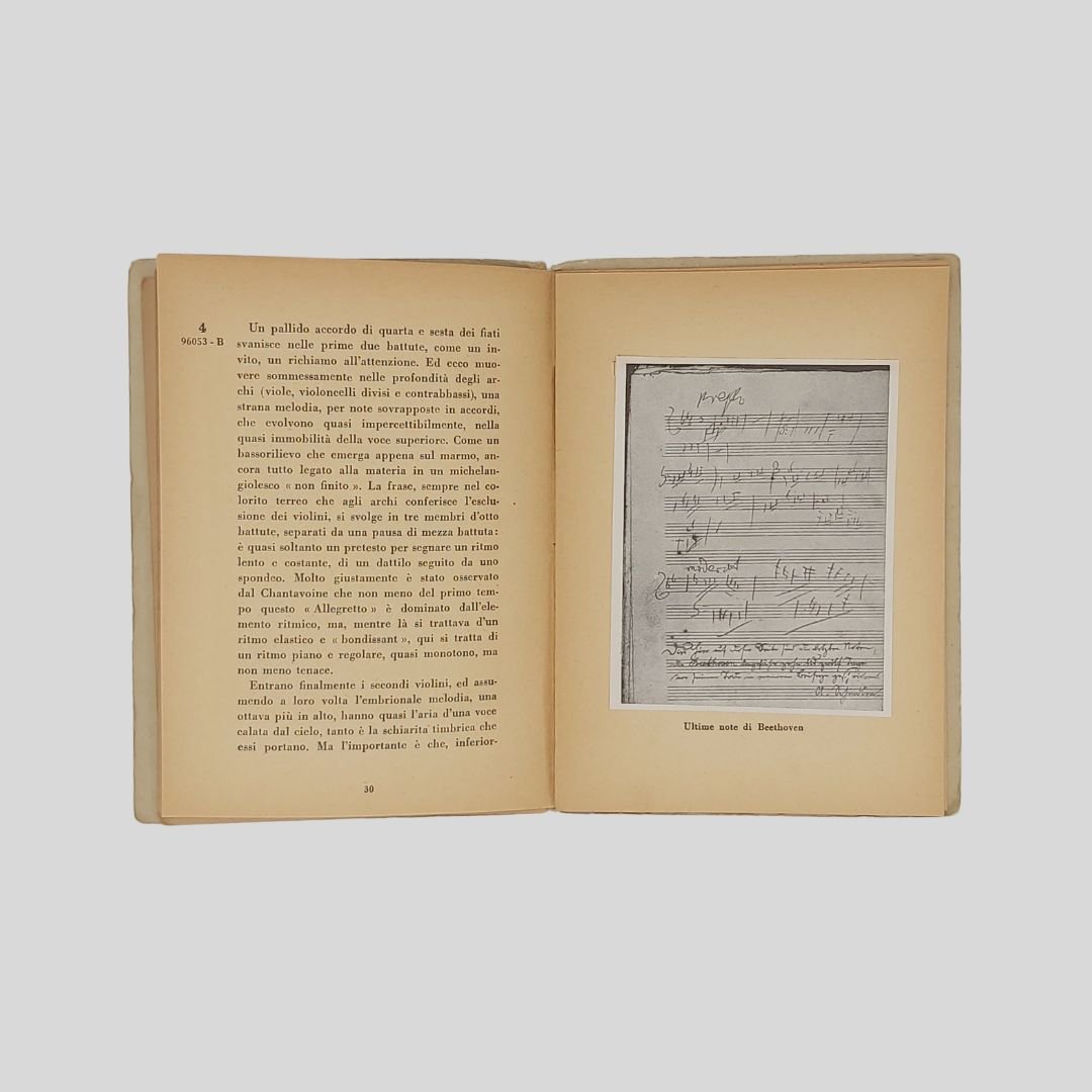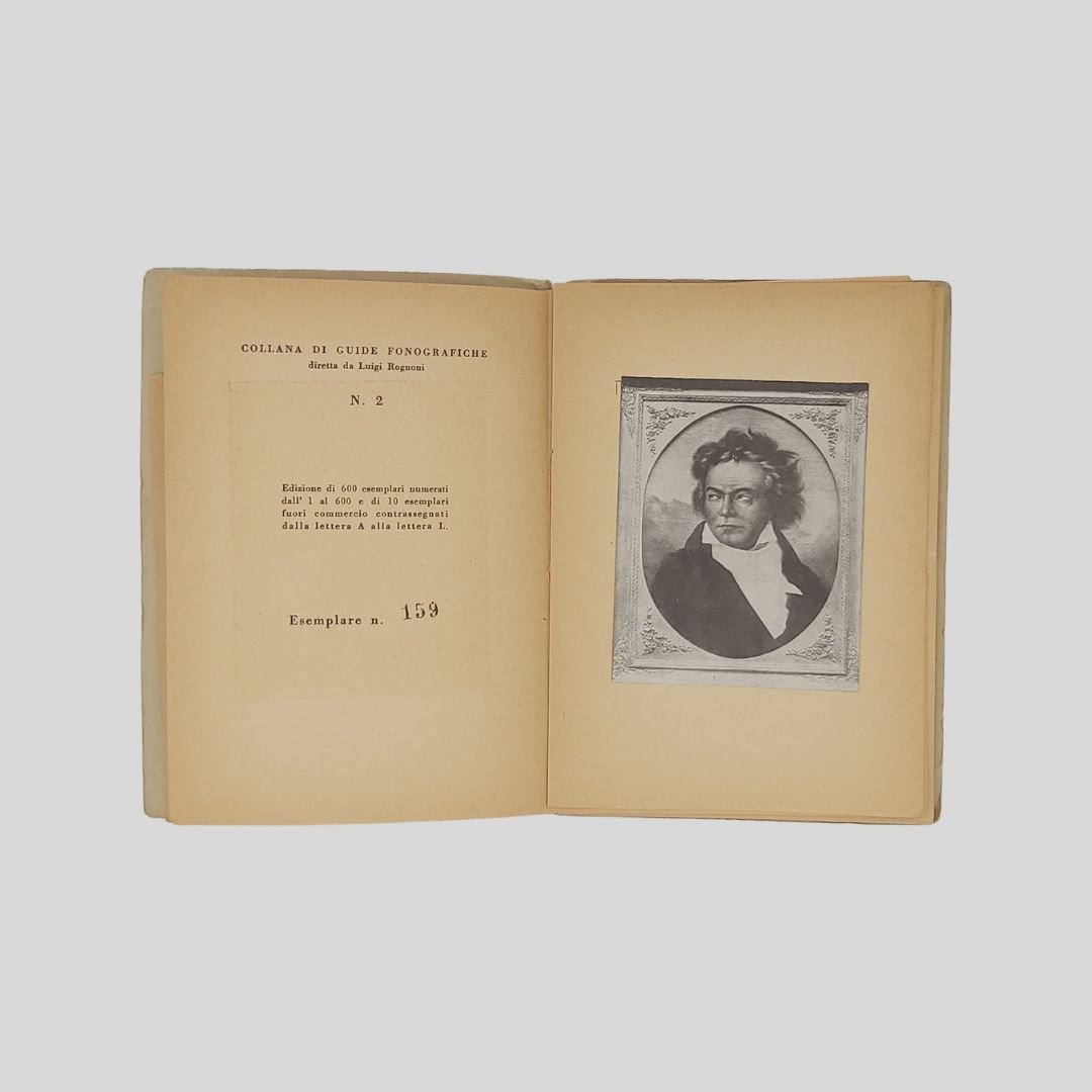 A cura di Massimo Mila. In-16 (cm 17), pp. 55 (5). Con due illustrazioni incollate al margine superiore, raffig. ritr. di B. e facs. e con otto esempi musicali interc. Menda al dorso e strappetto con perdita di carta alla prima carta b. Edizione di 600 esemplari numerati da 1 a 600 (ns. 159).