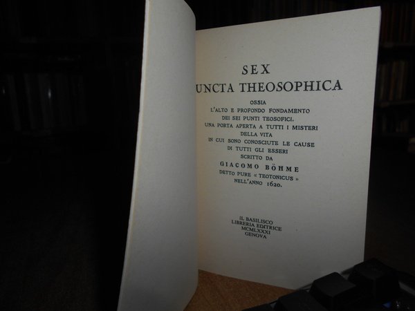 Jacob Böhme. Genova, Il Basilisco, 1981. SEX PUNCTA THEOSOPHICA ossia l' alto e profondo fondamento dei sei punti teosofici, una porta aperta a tutti i misteri della vita. In-16° piccolo, cartoncino edit. 191 pp. Come nuovo. Neg. esot. mob. 101