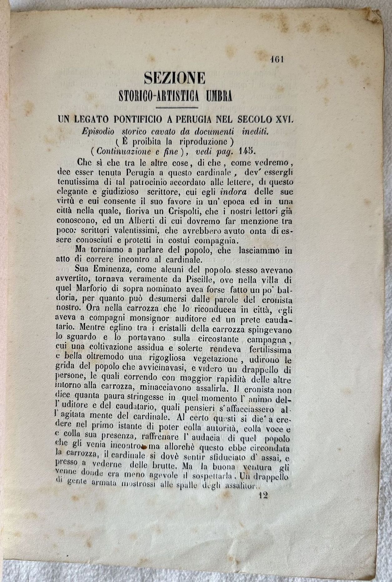 Interessante pubblicazione estratto da un volume, sezione storico artistica dell'Umbria. Senza data ma del 1842 circa. All'interno: Un legato pontificio a Perugia nel secolo XVI (Continuazione e fine); Cannara; Collazzone; Un curioso costume vigente ancora nel secolo XVI nel comune di Bettona. In buone condizioni. Copertina morbida coeva in buone condizioni generali con lievi usure ai margini e dorso. Legatura in buone condizioni. All'interno le pagine si presentano in buone condizioni con fioriture. In 8. Dim. 21,5x14,5 cm. Pp. 161-192. Interesting pamphlet extract from a volume, sezione storico artistica dell'Umbria. Not dated but of 1842 circa. Inside: Un legato pontificio a Perugia nel secolo XVI (Continuazione e fine); Cannara; Collazzone; A nice costume still existing in XVI century in Bettona. In good conditions. Soft coeval cover in good general conditions lightly worn in the edges and spine. Binding in good conditions. Inside pages are in good conditions with foxing. In 8. Dim. 21,5x14,5 cm. Pp. 161-192.