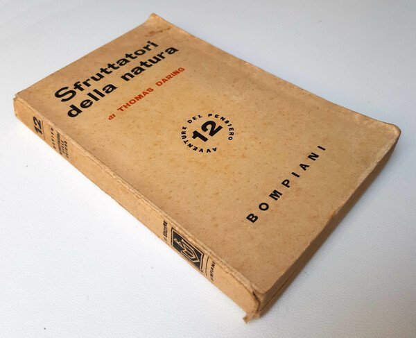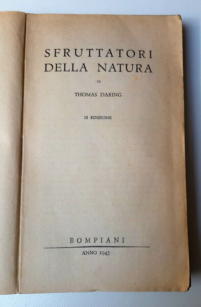 Un volume, 20,5 x 12 cm, pp. 255, (7); frontespizio a caratteri neri, alcune illutrazioni su tavole f.t. in b/n; leg. in brossura editoriale in cartoncino opaco beige con titolo a caratteri neri al piatto ant. e al dorso liscio; traduzione del Dott. Volonterio dal testo originale tedesco "Ausbeuter der natur"; opera facente parte della ricca collana scientifica a carattere divulgativo edita da Bompiani negli anni della Seconda Guerra Mondiale, Avventure del pensiero, n. 12. Rif.: IT\ICCU\RMS\0124063. Cond.: tracce d'uso e presenza di qualche piccola macchia; opera in buone condizioni generali.