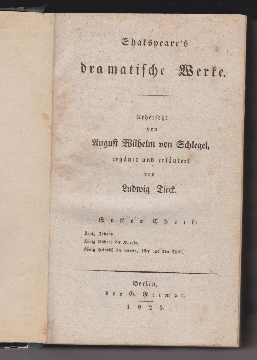 Schlegel Erstausgabe WG2.59; Tieck Erstausgabe WG2.51. - 1. Teil: Vorrede von L. Tieck. / König Johann / König Richard der Zweyte / König Heinrich der Vierte. - 2. Teil: König Heinrich der Fünfte. / König Heinrich der Sechste.