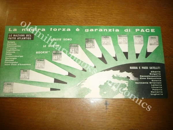 DESCRIZIONE: Apollon Roma 1950?, br. ed. ill., pp. 4 in 16°. Manifestino a favore del Patto Atlantico contro il Patto di Varsavia. Il Trattato Nord Atlantico, anche conosciuto come Patto Atlantico, è un trattato difensivo firmato da Stati Uniti, Canada e vari Paesi dell'Europa occidentale nel 1949. Ha dato origine alla NATO, rappresentando nel corso della guerra fredda il cosiddetto blocco occidentale. La nascita dell'accordo trova origine dal timore, molto radicato in quel periodo, di un possibile attacco dell'Unione Sovietica a una delle nazioni dell'Europa occidentale. Una settimana dopo l'ingresso ufficiale della Germania Ovest nella NATO (6 maggio 1955) l'Unione Sovietica ed altre nazioni a regime comunista costituirono a loro volta il patto di Varsavia, sancendo l'inizio del periodo della cosiddetta guerra fredda. CONDIZIONI: Perfette, piccola scritta all'ultima pag. PESO / WEIGHT: 20 gr. without package