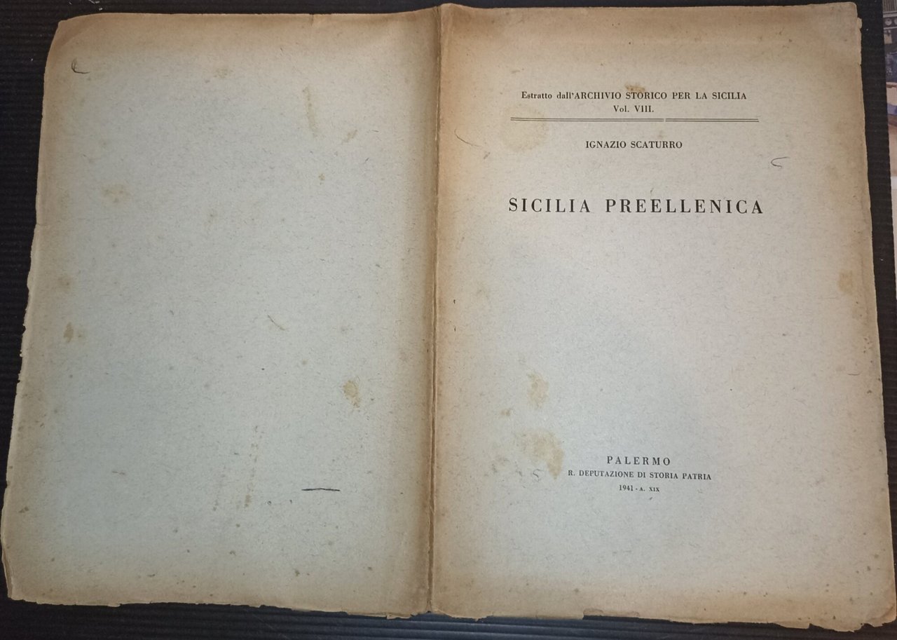 In 8', punto di metallo, pp. 32, intonso, estratto dall'Archivio Storico per la Sicilia Vol. VIII; strappi e mancanze al dorso, piccoli strappi ai margini del piatto post., punte degli ang. ant. inf. arricciati, bruniture, segni del tempo, discrete condizioni. ***Due to bureaucratic reasons, books dated over 70 years old cannot be immediately exported, please contact us before placing the order.***
