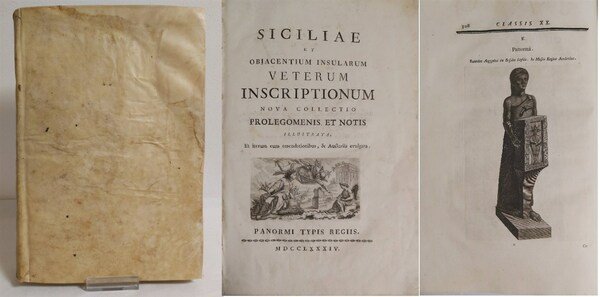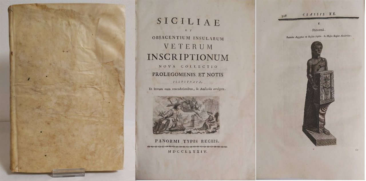in folio, pp. LXXVI, 344, bella leg. p. perg. coeva con tit. mss al d. Gr. vignetta in rame al front. con fig. allegoriche. Con una tav. in rame ripiegata di monete dell'antica Sicilia. Numerose iniziali e testat. in rame, iscrizioni xilogr. n.t. e nell'ultima parte grandi incisioni in rame di vasi, reperti, marmi. Noto anche con lo pseudonimo di Selinunte Drogonteo, Gabriello Castelli principe di Torremuzza (Palermo 1727-1794) fu antiquario e numismatico. Seconda rara edizione ampliata sulla prima del 1769. Le iscrizioni sono classificate in 20 tipologie. ;ira I, p.197: "Raro [.] Degne sono di ammirazione le iscrizioni delle gemme, degli anelli, de' sigilli, dei pesi, delle lucerne, de' vasi di Creta, e quelle scritte con caratteri esotici. A questa raccolta precede prima della prefazione una tavola contenente 30 delle più belle e rare medaglie della Sicilia". Picc. lavoro di tarlo sulle ultime 20 carte. Integraz. della perg. al margine superiore dei piatti. Bell'esempl. di rara opera. [526]