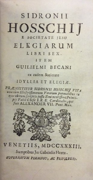 In-16 (mm. 174x90), 2 opere in 1 volume, p. pergamena coeva, tit. ms. al dorso. La prima, di pp. XXIV,317, contiene elegie di Hossche e (da p. 239) idilli ed elegie del gesuita Becano; la raccolta è introdotta da una Vita' del gesuita Sidron Hossche (1596-1653) che fu poeta assai stimato.La seconda, di pp. (16),310,(2), contiene Jacobi WALLIJ e Societate Jesu "Poematum" libri novem. Editio nova, cui accedit posthuma ad elegias appendix. Raccolta di elegie religiose seicentesche di tre padri gesuiti belgi.Cfr. Brunet,VI,13052 che cita un'ediz. di Parigi, 1723.Esemplare ben conservato.