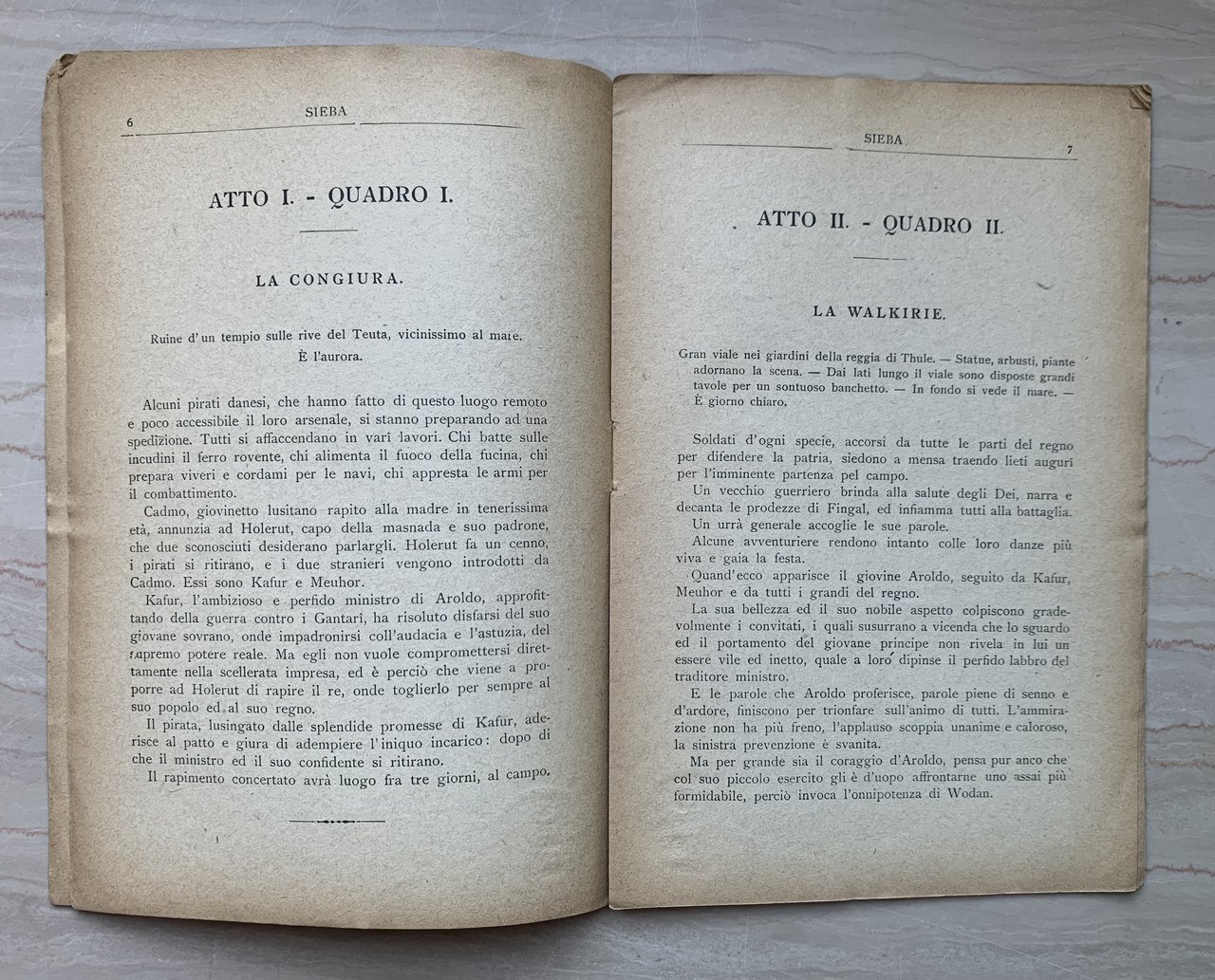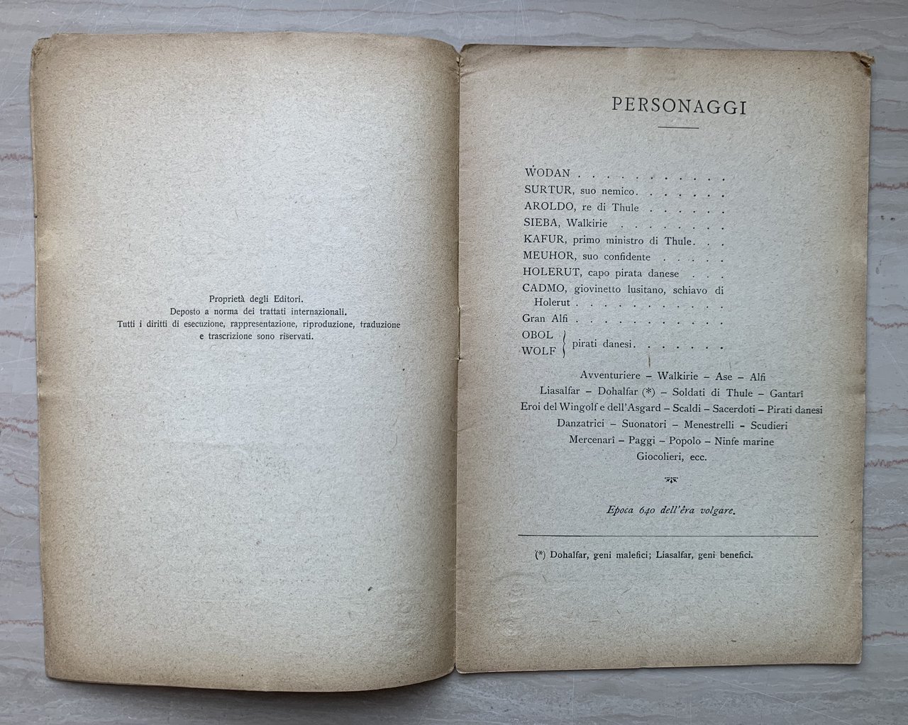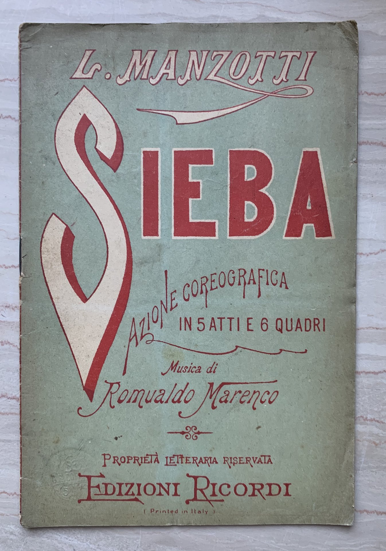 ed.: 5 19, dal timbro a secco in copertina (1a rappresentazione: Torino, Teatro Regio di Torino 1878). VIII piccolo/16/brossura in cartoncino liscio avorio con titoli e ornati in celadon e rosso e avorio ai piatti. Stato buono (usura della copertina, in particolare ai margini e al dorso - copertina e pagine con qualche piegatura, in particolare agli angoli superiori - copertina e pagine brunite - timbro a secco dell'Editore all'angolo inferiore sinistro della copertina che, peer contatto, prosegue scemando nelle pagine successive - affrancatura con prezzo in frontespizio - piccolissimo residuo di etichetta in quarta di copertina).