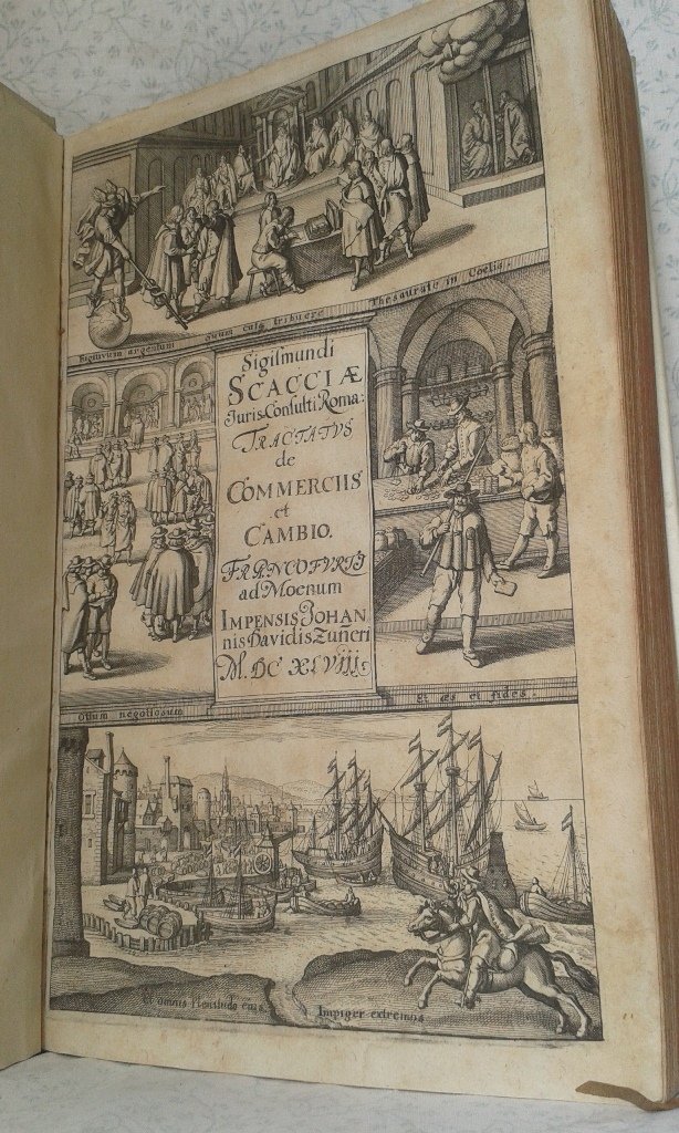 Volume in folio legato in pergamena moderna rigida con legacci, sguardie, splendida antiporta incisa in rame a piena pagina con quattro vignette che incorniciano il titolo, tutte a carattere 'commerciale' (tutte molto belle, la superiore e l'inferiore pi grandi, l'inferiore con due galeoni ed innumerevoli barche alla fonda nel porto di una munira citt ed una staffetta postale al galoppo in primo piano), frontespizio in rosso e nero con grande marca silografica dello stampatore, al verso grande vignetta con insegne episcopali (probabilmente di Giovanni Filippo, arcivescovo moguntino), tre carte, bianca, 520 pp., 45 carte d'indici, al verso dell'ultima colophon preceduto dalla marca tipografica iniziale. Seconda edizione di questo celeberrimo trattato sul commercio tanto ricercato quanto raro, qui presentato in magnifico stato completo della splendida antiporta tanto spesso mancante, appena brunito per effetto dell'acido inchiostro, senza altre evidenti mende. Certo che l'opera dello Scaccia caposaldo della teoria sul commercio in tutto il XVII secolo e trascende il mero valore antiquario essendo soprattutto testo di studio e ricerca sull'evoluzione del concetto economico e mercantile. Di esimia rarit.