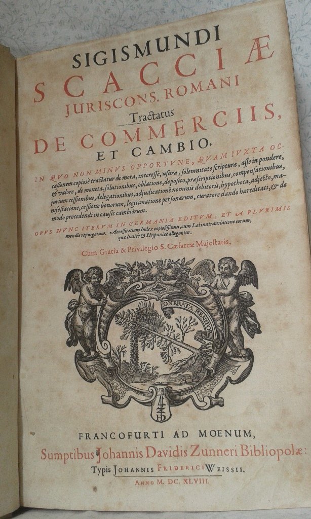 Sigismundi Scacciae Juris-Consulti Romani TRACTATUS DE COMMERCIIS ET CAMBIO in quo non minus opportune quam iuxta occasionem copiose tractatur de mora, interesse, usura, solemnitate scripturae, asse in pondere.