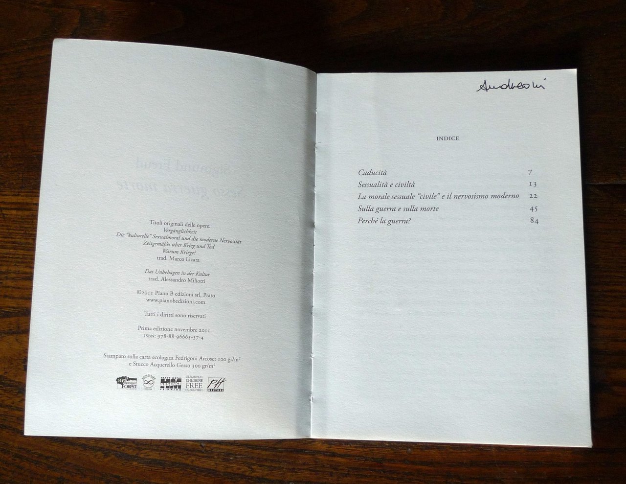Sigmund Freud,SESSO GUERRA MORTE.Piano B edizioni, Prato 2011,brossura, 17x12 cm., pp.108,collana ELEMENTI,ISBN: 978-88-96665-37-4,peso: g.200cod.9848CONDIZIONI DEL LIBRO: molto buone,imperfezioni alla copertina,firma nella pagina dell'indice,sottolineature a matita