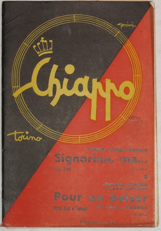 In 8. cm 26,5x18. Pp. 43. Partitura completa per orchestra del 1934 di due canzoni. Caratteristica copertina decorata dell'epoca. Ex libris sulla copertina. Ottime condizioni. A complete score for orchestra of 1934. Carachteristic decorated cover of that period. Ex libris in the cover. Very good conditions.
