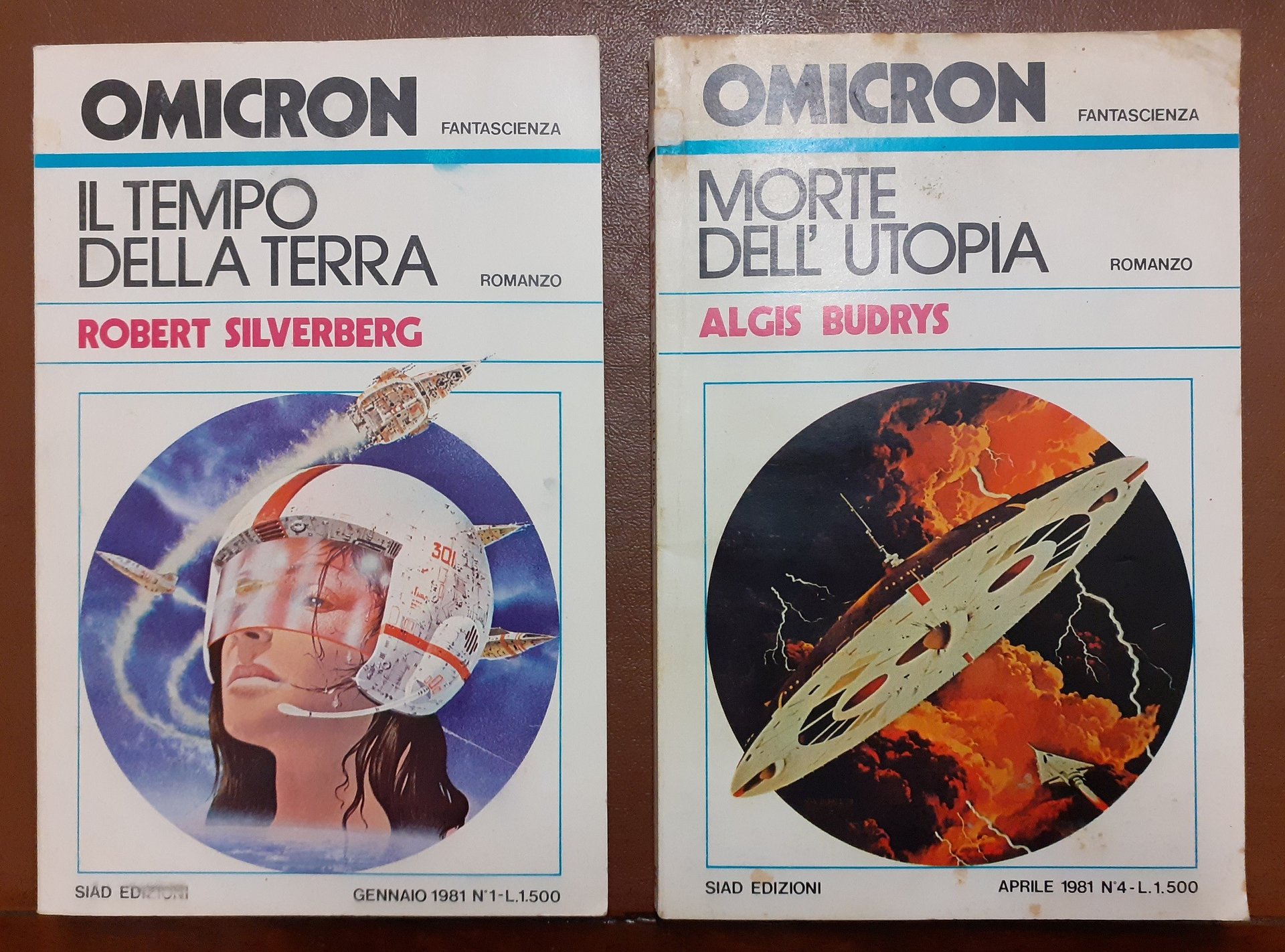 Robert Silverberg, Il tempo della terra, Siad Edizioni, Milano 1981, pp. 127, cm 19, br. ed. (Collana Omicron fantascienza, vol. 1, gennaio 1981. Titolo originale: Stepsons of Terra. Traduzione di Vittorio Curtoni). In lotto con: Algis Budrys, Morte dell’utopia, Siad Edizioni, Milano 1981, pp. 127, cm 19, br. ed. (Collana Omicron fantascienza, vol. 4, aprile 1981. Titolo originale: The Amsirs and the Iron Thorn. Traduzione di Roberta Rambelli).Il lotto comprende i due volumi Il tempo della terra, di Robert Silverberg, e Morte dell’utopia, di Algis Budrys, entrambi per i tipi Siad Edizioni, collana Omicron fantascienza, voll. 1 e 4. Copertine di Franco Storchi. Testo su due colonne.Residuo di piccola etichetta adesiva rimossa al dorso di ciascun volume, leggere tracce d’uso, minime fioriture, lieve ingiallitura della carta, per il resto buone copie.