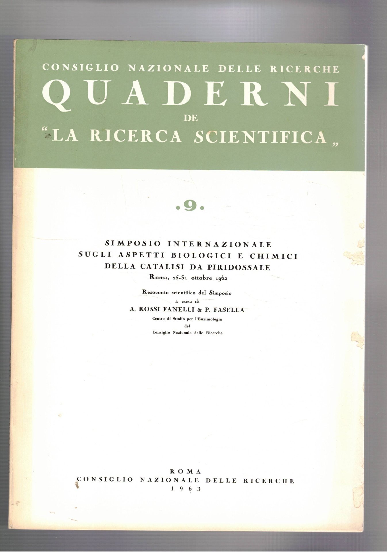 Simposio internazionale sugli aspetti biologici e chimici della catalisi da piridossale. Ott. 1962. Quaderno della Ricerca scientifica del C.N.R. n°9 del 1963. Edizione speciale fuori commercio.