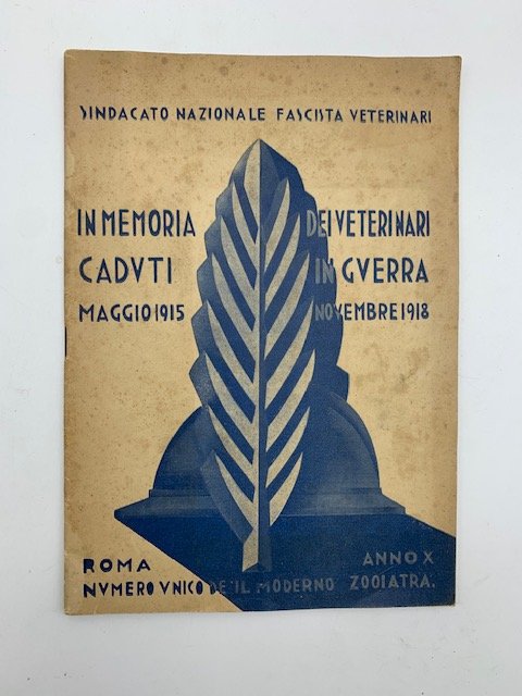 In 8 (cm 18,5 x 26), pp. 44 con riproduzioni fotografiche in bianco/nero nel testo. Brossura editoriale. Numero unico della rivista 'Il moderno zooiatra' dedicato ai veterinari caduti durante la prima guerra mondiale in occasione dell'inaugurazione della lapide a loro dedicata con i nomi dei 39 ufficiali morti durante la grande guerra (con riproduzione fotografica della lapide).