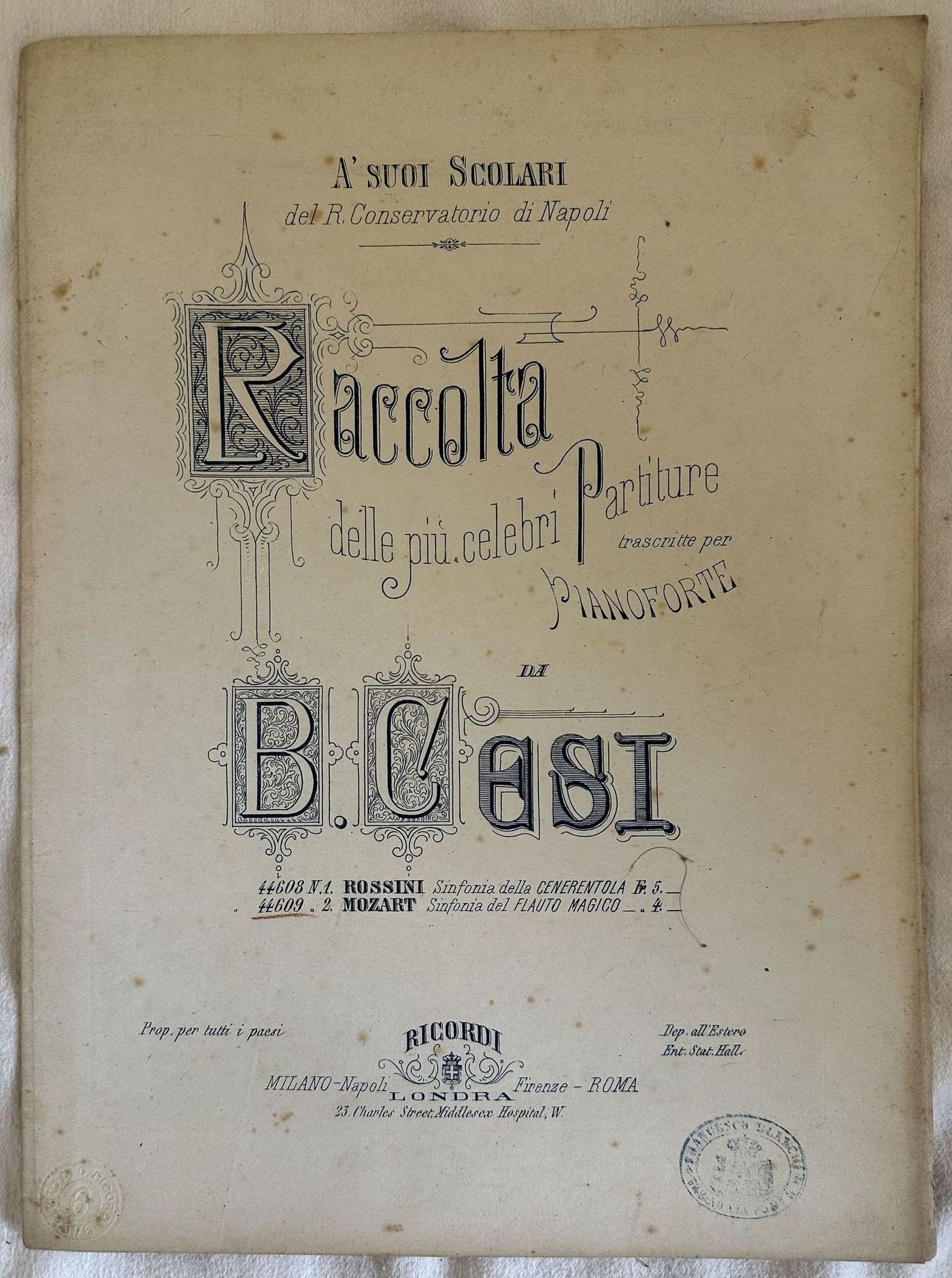 Edizione Ricordi del giugno 1876 della melodia "Flauto magico" di Mozart (1756-1791) della collana "Raccolta delle più celebri partiture trascritte per pianoforte da B. Cesi". Bel frontespizio illustrato. In ottime condizioni. Copertina editoriale in ottime condizioni con lievi usure ai margini e dorso. Legatura in buone condizioni. Pagine in ottime condizioni con rare fioriture. In folio. Formato cm. 34,5x25,5. Pp. 11Ricordi edition of june 1876 of the melody "Flauto magico" by Mozart (1756-1791) of the series "Raccolta delle più celebri partiture trascritte per pianoforte da B. Cesi". Beautiful illustrated title page In very good conditions. Editorial cover in very good conditions slightl worn in the edges and spine. Binding in good conditions. Pages in very good conditions with occasional foxings. In folio. Formato cm. 34,5x25,5. Pp. 11<BR><BR>