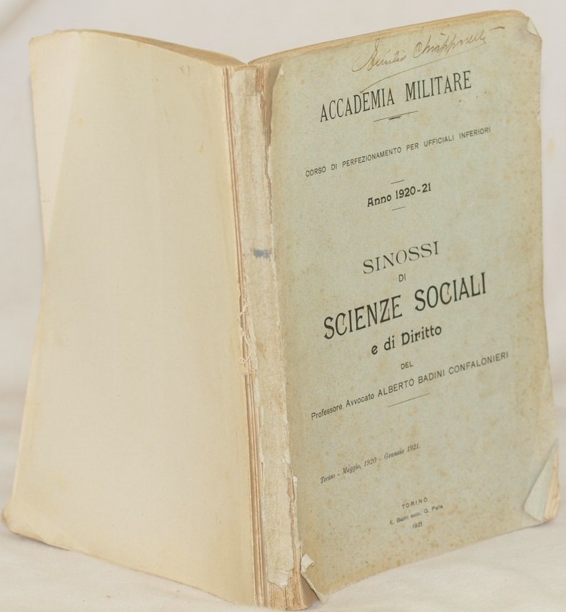 In 8. Dim. 24x17,5 cm. Pp. 332+(6). Rara raccolta di appunti manoscritti in copia litografata editi dall'Accademia militare ad uso del Corso di Perfezionamento per ufficiali inferiori per l'anno 1920-21 scritto dall'Avvocato Alberto Badini Confalonieri. Come indicato al frontespizio sono fuori commercio. All'interno: diritto costituzionale, amministrativo, penale, diritto penale militare, internazionale, Economia politica, Questione sociale, Emigrazione, Pedagogia militare ecc. Firma in copertina. In mediocri condizioni. Copertina editoriale in mediocri condizioni generali con lievi usure ai margini e dorso. Piatto posteriore assente. Legatura quasi assente. Pagine in discrete condizioni con rare fioriture. Scarce collection of manuscripted notes lytographed in copy edited by Military Academy for the usage of Corso di Perfezionamento per ufficiali inferiori for the year 1920-21 written by the lawyer Alberto Badini Confalonieri. Out of trade copy as indicated in the title page. Inside: Constitutional, administrative, penal, military, international right, military penal right, Political economy, Social issue, Emigration, Military pedagogy ecc. Signature in the cover. In poor conditions. Editorial cover in poor general conditions slightly worn in the edges and spine. Back plate is missing. Binding is almost missing. Inside pages are in fair conditions with occasional foxings.