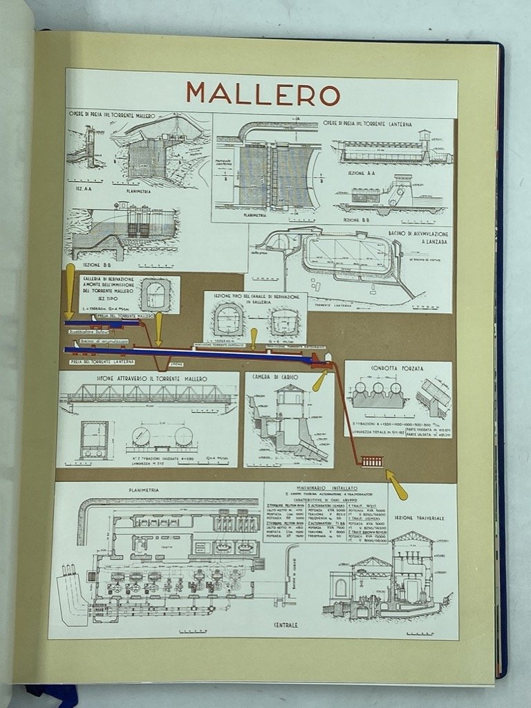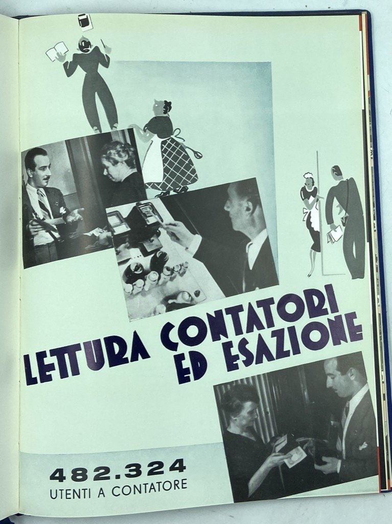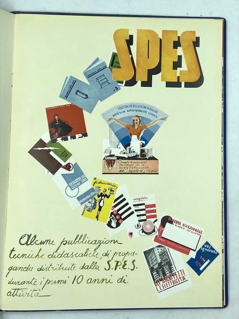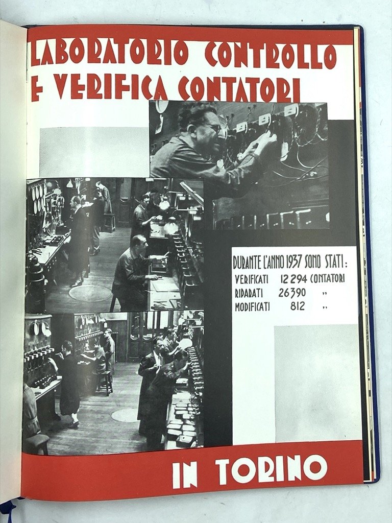 Tela editoriale blu con titoli bianchi, cm 32.5 x 24.5, pp (28) 222 (6) illustrate a colori, sguardie decorate, carte di indice ripiegate. Tela della legatura scolorita per esposizione alla luce, lievi segni d’uso sui grandi titoli, internamente volume in perfetto smagliante stato di conservazione. Curiosa ed originale pubblicazione aziendale che celebra i primi quattro decenni di attività della Società Idroelettrica Piemonte attraverso una serie di particolari e coloratissime tavole; il volume fu preparato internamente alla società da Agostino Dalla Verde, Giulio Gentile e Arnolfo Pernier e stampato in 2500 esemplari numerati (questo uno dei 2450 della tiratura ordinaria) a cura di Enrico Faudone e Giovanni Botto. Dopo un breve testo introduttivo, che annuncia la parallela pubblicazione dell'analogo - seppur molto differente - volume dedicato all'EIAR, l'intera esposizione dell'attività della SIP è affidata alle tavole: grafici, disegni, fotomontaggi, manifestini e slogan illustrano nell'ordine Generalità, Centrali idrauliche, Centrali termoelettriche, Linee di trasmissione, Distribuzione, Attività non elettriche (SPES, EIAR, Società Editrice Torinese, Società Immobiliare Calabra); due carte di indice ripiegate a fine volume possono essere aperte per facilitare la consultazione. Tra gli impianti illustrati Gran Scala (Moncenisio),Venaus, Maen, Mompantero, Perreres, Cignana, Perreres, Covalou, Chatillon, Isollaz, Vizzola, Gressoney La Trinité, Pont S. Martin, Mallero, Crava, Verduno, Roddi, Alba, Turbigo, Bordogna, Val Brembana (Colombo, Gemelli, Sardegnana). Grilllo, Il libro fotografico italiano 1931 - 1941, p. 158: «uno stravagante volume celebrativo, costruito con una serie di tavole a colori - graficamente piuttosto ruspanti - che mescolano grafici, schemi informativi e fotografie, dedicato alle aziende del gruppo e ai loro stabilimenti sul territorio».