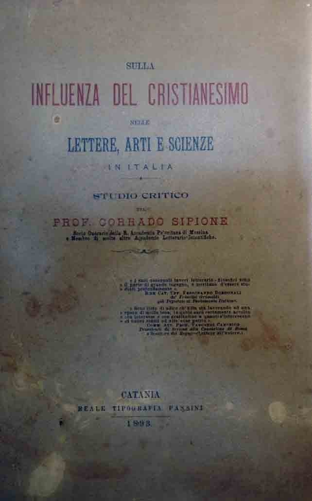 Corrado Sipione, Sulla influenza del cristianesimo nelle lettere, arti e scienze in Italia. Studio critico, Reale Tipografia Pansini, Catania 1893, pp. 85, cm 24, br. ed. Dorso riparato, copertina posteriore mancante, ma interno in buono stato. Estremamente raro.