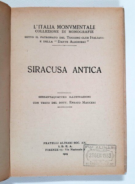 Siracusa antica - L'Italia Monumentale - Collezione di monografie sotto il patronato del Touring Club Italiano e della "Dante Alighieri" - N. 32 - sessantaquattro illustrazioni con testo del Dott. Enrico Mauceri - Testo italiano, francese, inglese