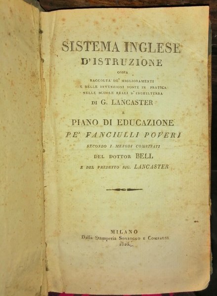Sistema inglese d'istruzione ossia Raccolta de' miglioramenti e delle invenzioni poste in pratica nelle scuole reali d'Inghilterra di G. Lancaster e Piano di educazione pe' fanciulli poveri secondo i metodi combinati del dottor Bell e del predetto sig. Lancaster