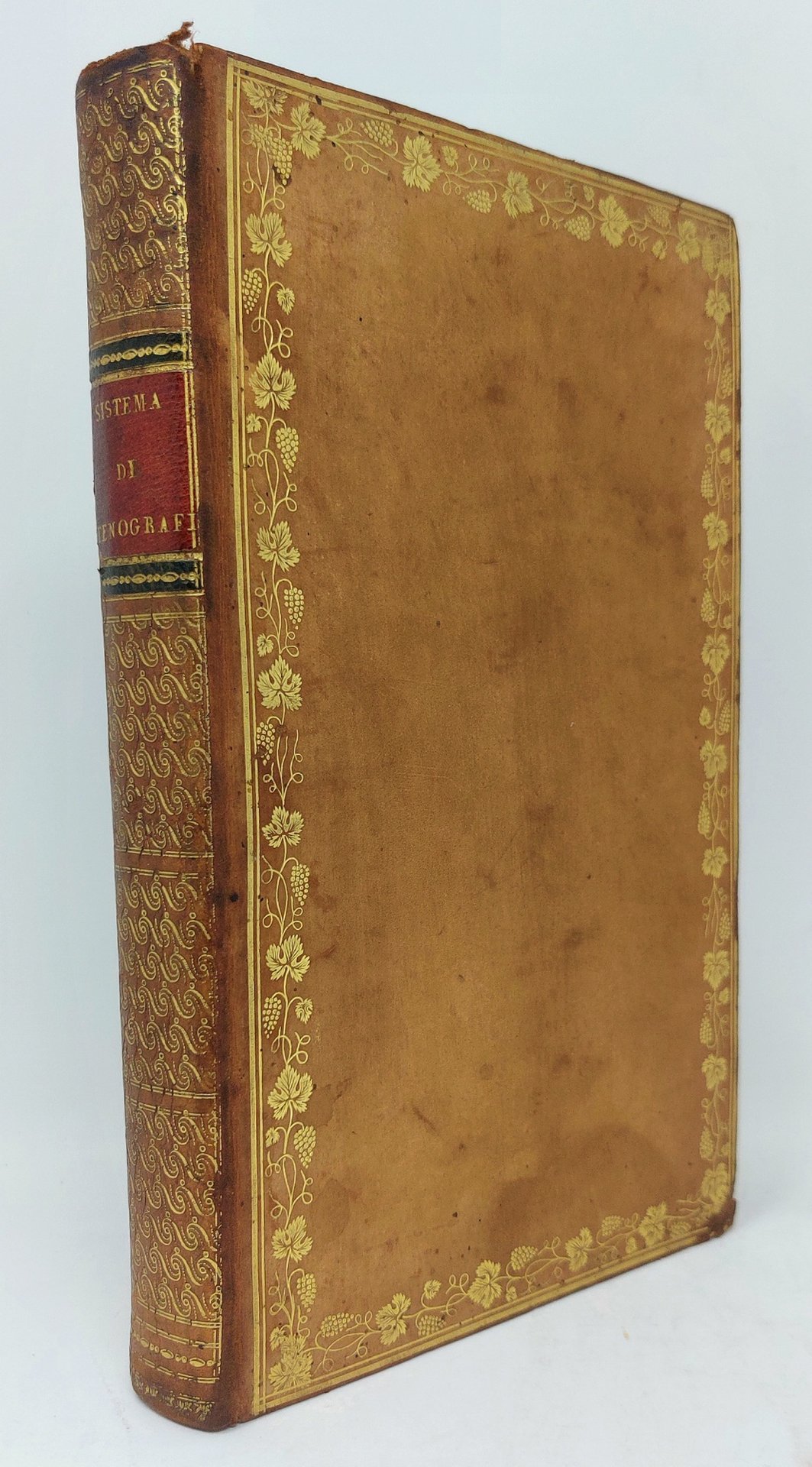 >in-4 (225x142 mm.), pp. XXXIX, 118, con 9 tavole incise f.t. delle quali la prima all'inizio ''Prospetto del Meccanismo della Scrittura Stenografica, e Firma dei caratteri stenografici...''. Bella legatura coeva in pieno vitello biondo, elegante bordura a fogliame sui piatti, dorso ornato e con titolo su tassello, il tutto in oro, tagli dorati, dentelle int. E' l'edizione italiana del ''Universal System'' elaborato da S.Taylor (1749-1811), metodo nuovo che si basò dal punto di vista linguistico sulle consonanti, prende spunto dai primi saggi stenografici creati nell'antichità dai Greci (Xenofonte e Socrate) e dai romani (Tiron e Cicerone). Trattasi del secondo trattato sulla materia apparso in Italia, dopo gli sviluppi e le trasformazioni di questa scrittura abbreviata avvenuti nei secoli precedenti in Francia e in Inghilterra, molto importante. Impresso con gran cura editoriale, molto più profondo e pratico di quello del Molina del 1797, Assai raro e importante trattato sulla stenografia, bellissimo esemplare su carta forte, in legatura d'amatore. Non descritto nelle bibliografie consultate.