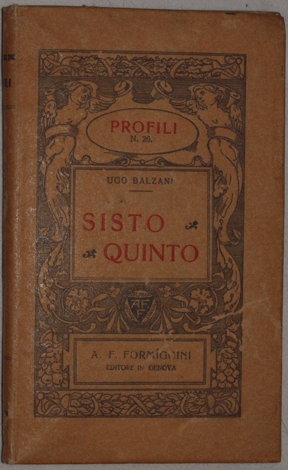 In 16. Dim. 17,5x10,5 cm. Pp. 74+(3). Bel volume del 1913 della serie "Profili" dell'editore Formiggini su Papa Sisto V scritto da Ugo Balzani. Belle vignette e lettere decorate all'interno. Copertina editoriale pergamenacea. In buone condizioni. Copertina editoriale in buone condizioni generali con lievi usure ai margini e dorso. Legatura in buone condizioni. All'interno le pagine si presentano in ottime condizioni con rare fioriture. Beautiful volume of 1913 of the series "Profili" of the editor Formiggini about the Pope Sisto V written by Ugo Balzani. Beautiful vignettes and decorated initial letters. Parchment editorial cover. In good conditions. Editorial cover in good general conditions slightly worn in the edges and spine. Binding in good conditions. Inside pages are in very good conditions with occasional foxings.